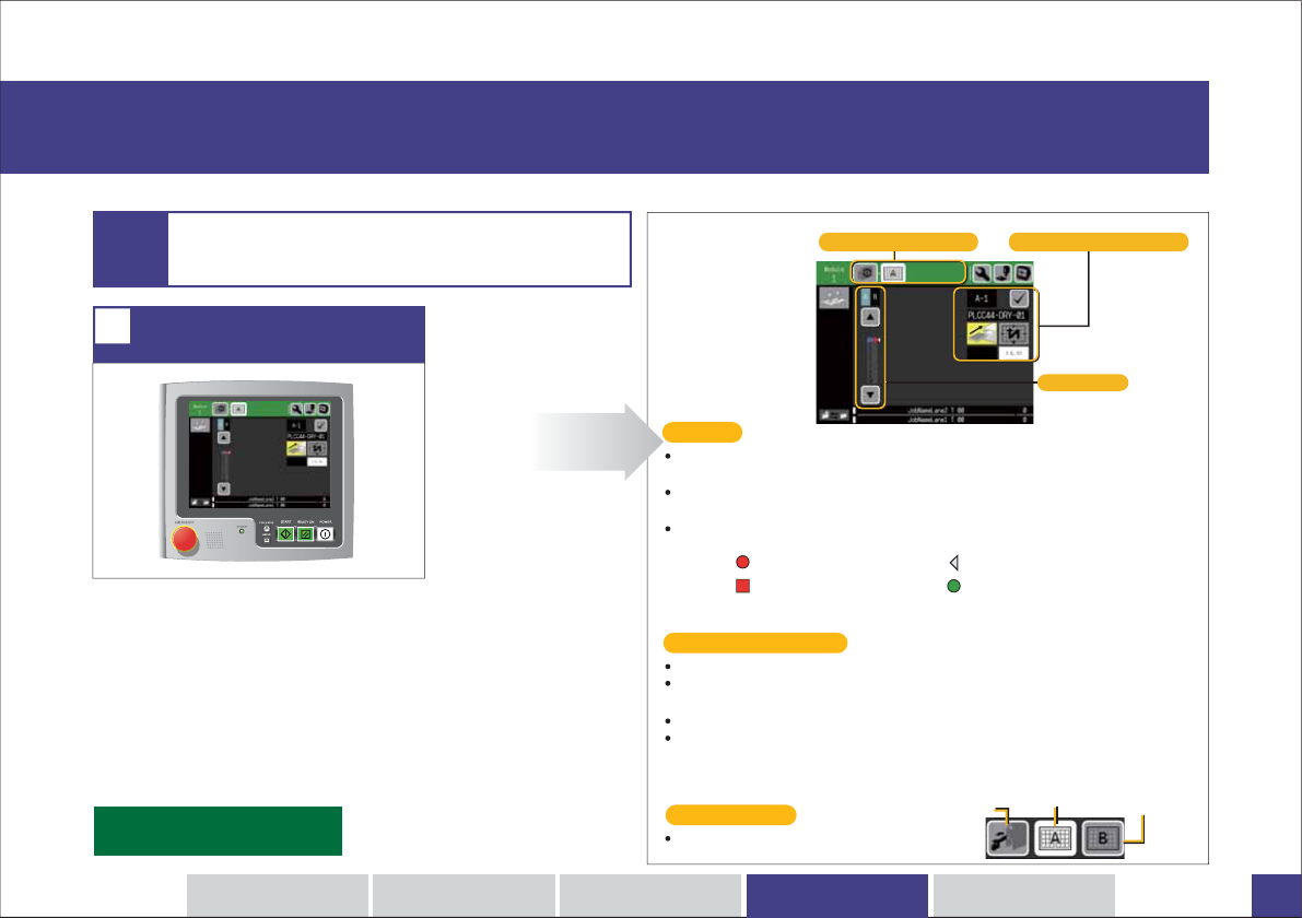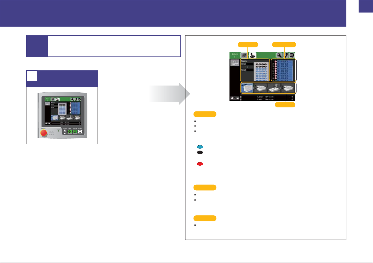 38 确认向导画面。 确认向导画面。 STEP 1 请确认向导画面。 1 请确认需要更换的吸嘴置放台和吸嘴。 更换向导 需要更换成被显示的吸嘴置放台类型。 不需要进行吸嘴置放台更换时,仅仅显示被安装的吸嘴置放台类型。 是被安装在各收存格中的吸嘴的状态影像。 根据吸嘴的状态,收存格号码的背景色不相同。 作业步骤 各示意图表示必要的作业。请从左侧的作业开始。 蓝色:生产中使用的吸嘴。 需要换线。 黒 色: 不需要进行生产中使用吸嘴的安装。 …