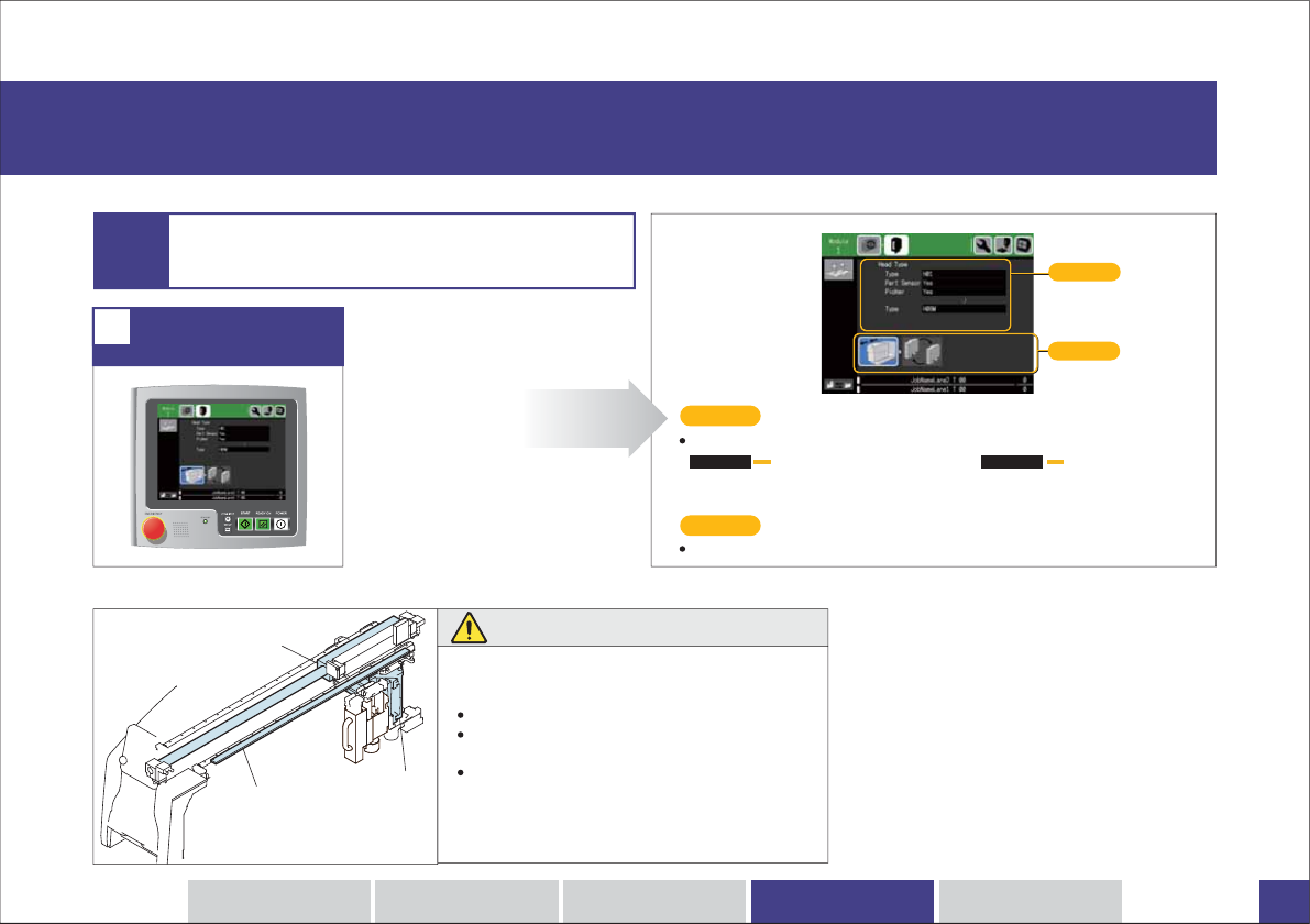 机器概要 生产准备 生 产 示意图 49 请确认向导画面。 1 请确认需要安装的工作头。 换 线 确认向导画面。 确认向导画面。 STEP 1 更换向导 作业步骤 是工作头的更换向导。 显示进行更换的工作头的类型。 表示带支撑销吸取器的工作头。 各示意图显示作业内容。请从左侧的作业开始。 表示带带元件有无确认的 工作头。 Parts Sensor Picker 注意 注意 各模组的 Y 轴驱动使用了线性马达。 请注意以下各点。 请不要将…