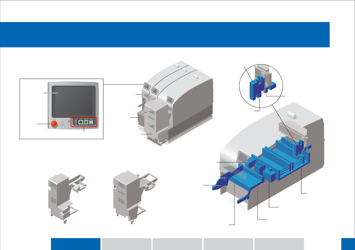 供料器托架 机器概要 生产准备 生 产 换 线 示意图 1 操作面板 料盘单元-LT 料盘单元-LTC 模组 基座 料盘单元 吸嘴 贴装工作头 定位相机 供料器 搬运轨道 吸嘴置放台 元件相机 显示屏 操作按钮 EMERGENCY 按钮 自动更换头置放台 机器概要 机器概要 1. 1. 各部分名称 各部分名称
