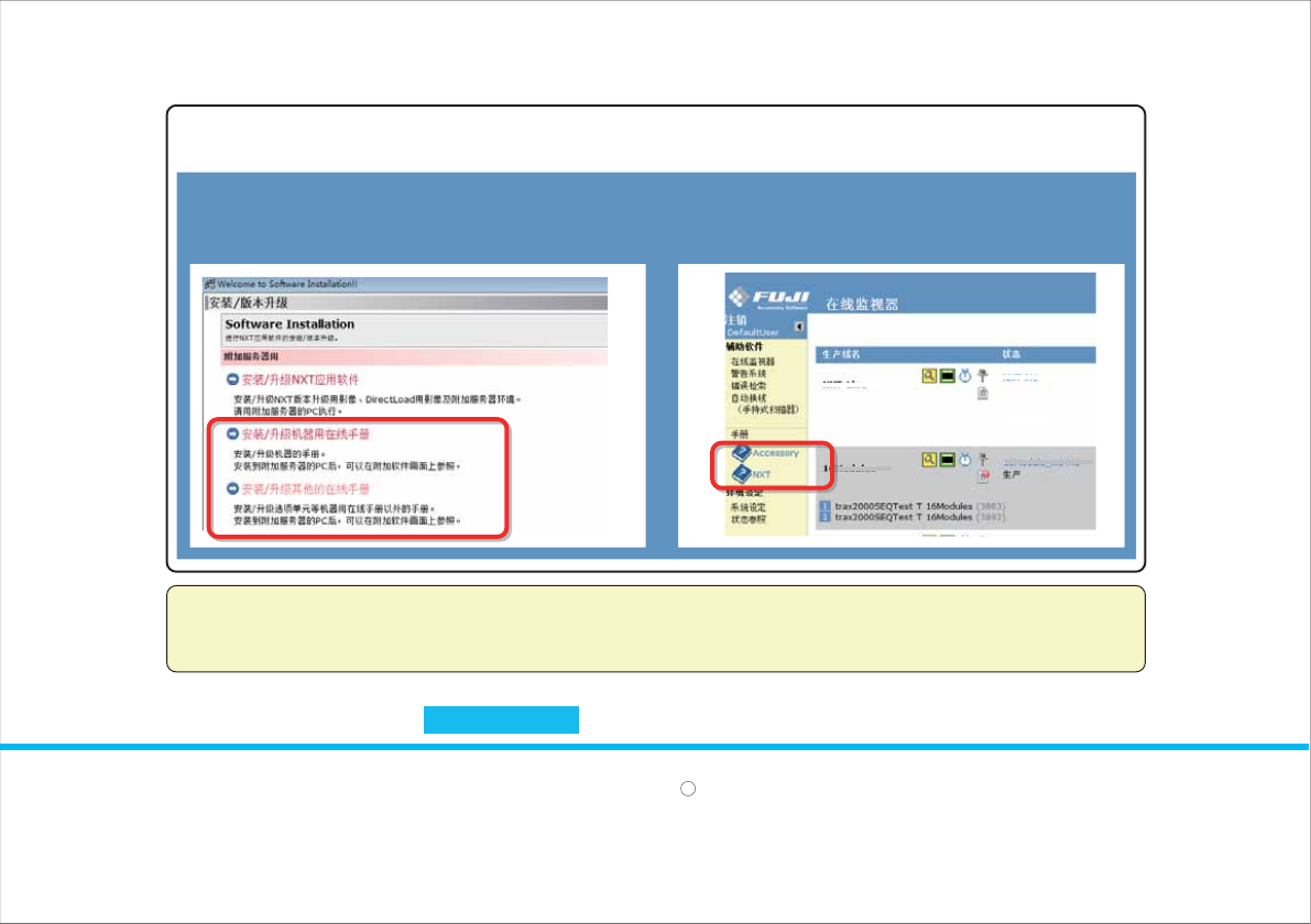 在线手册安装在辅助软件服务器用的PC内。 安装的PDF手册可以通过辅助软件的「在线手册」