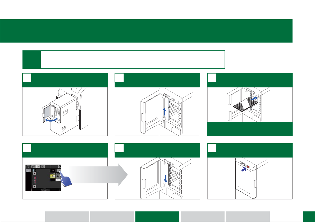 请打开门。 1 使用 KIT Handy 验证料盘。 3 请提起托架挡块。 2 拔出该料槽的空料盘,安装新的料盘。 4 关闭门,按下 COMPLETE 按钮。 6 请放下托架挡块。 5 关于验证,请参照[ Fujitrax Verifier 用户手册 ]的[ 5. 料盘元件的验证 ]。 向料盘单元 向料盘单元 -M -M 补充元件。 补充元件。 (验证 (验证 ON ON ) STEP 2 如果要进行料盘吸取点指定时, 请使用 KIT …