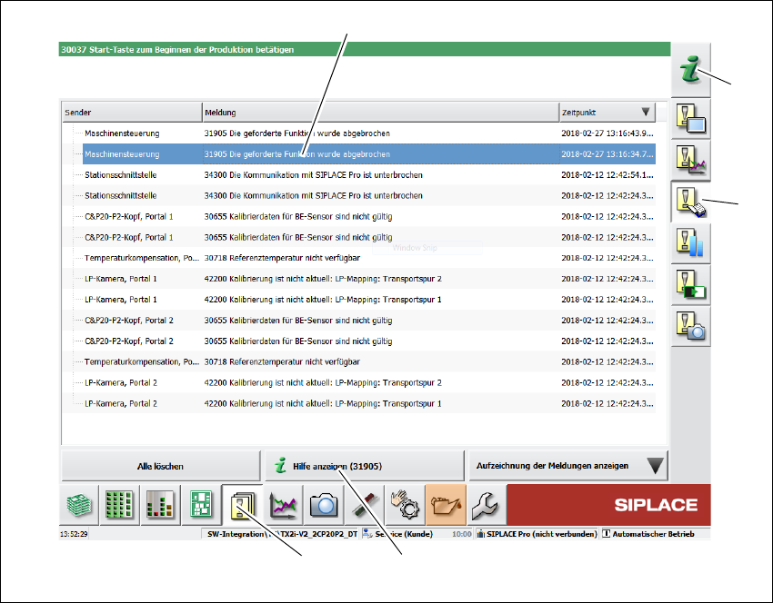 Betriebsanleitung SIPLACE TX-Serie 5 Aufgaben am Bestückautomate n Ab Softwareversion 713.0 Ausgabe 01/2020 5.6 Fehlermeldungen und Online Hilfe 245 5.6.3 Bedeutung der Farben in den Alarminformationen in der Onli ne-Hil…