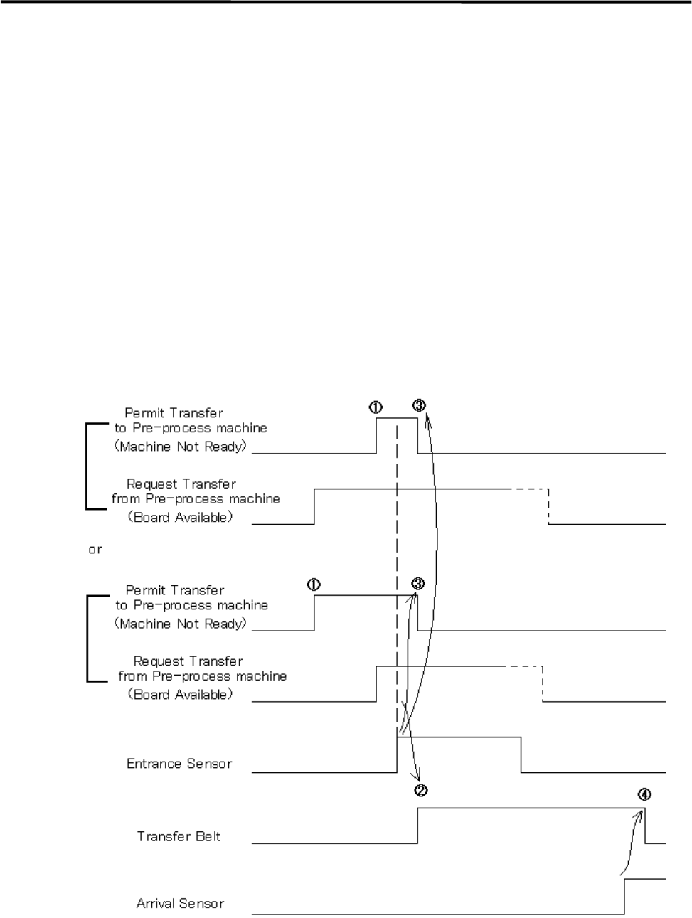 1 Installation 1-16 Sequence of Sending PC board (SMEMA Interface spec.) ① When the machine is ready to se nd PC board, the Request Transfer (Board Avai lable) is sent to Post-process machine. ② The transfer belt will be…