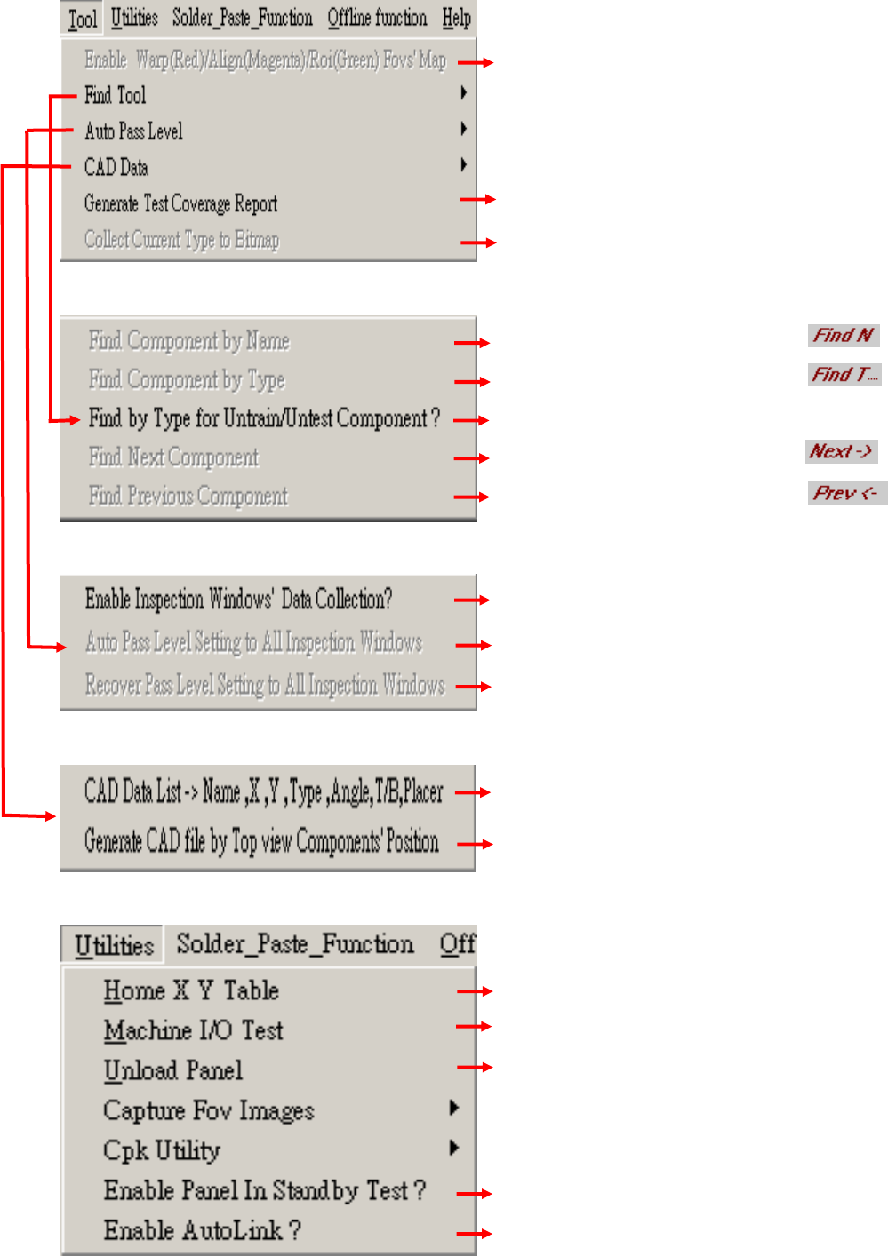 66 依種類尋找元件(下方有快捷列 ) 開啟 W arp/Align/Roi 在大圖裡的分佈情形 依種類尋找未轉換以及未測試的元件 產生測試涵蓋率報表 尋找下一個元件(下方有快捷列 ) 開啟檢測框資料的連結 CAD 資料清單 依據收集 30 筆資料自動設定參數值 回復未儲存的參數設定 依名稱尋找元件(下方有快捷列 ) 尋找上一個元件(下方有快捷列 ) 依種類收集影像 依 T op Camera 內檢測框的位置來產生 CAD File R…
