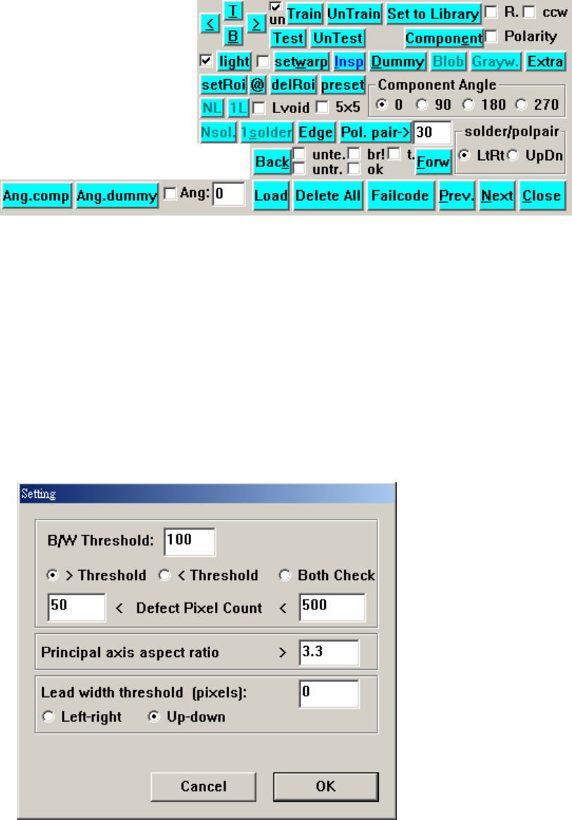 ¾ T 、 B 、 < 、 > :針對多功能框內做上下左右的移動 ¾ Tr a i n :針對整個 FOV 做影像的轉換 ¾ Untrain :針對整個 FOV 取消影像的轉換 ¾ Te s t :針對整個 FOV 設置 Te s t ¾ Untest :針對整個 FOV 設置 Untest ¾ Set Component :根據所輸入的名稱及種類,在多 功能框上新增一個元件檢測框 ¾ Dummy : 根據所輸入的名稱及種類…