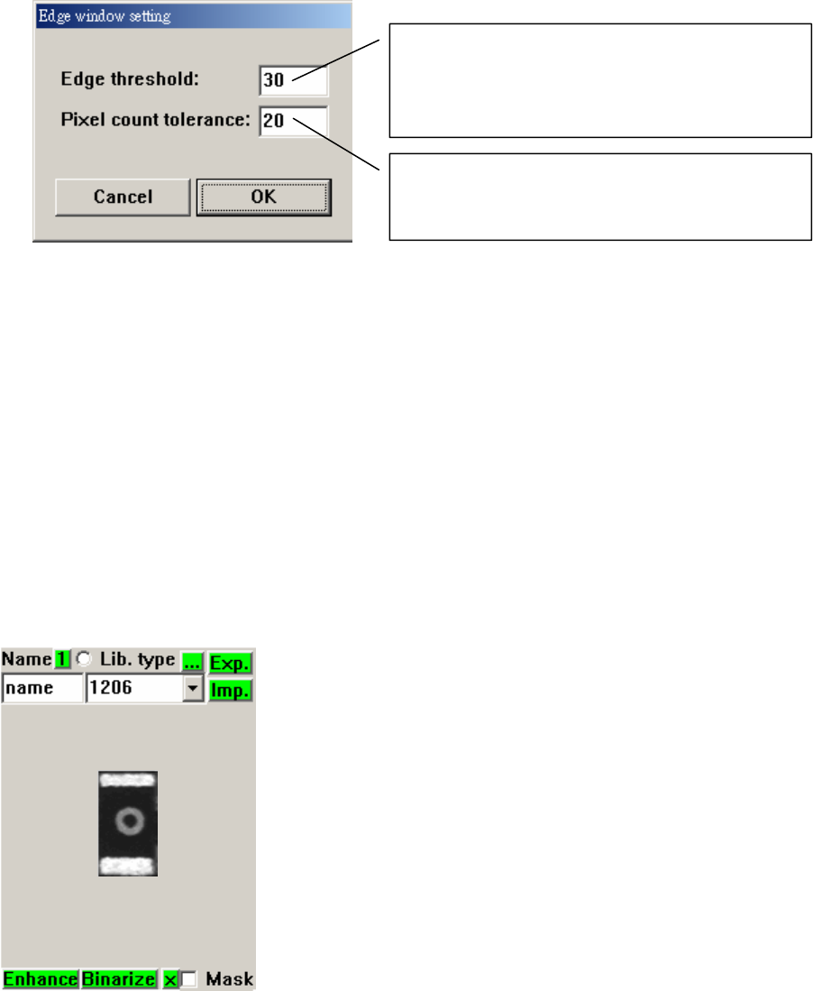 ¾ Edge :在萬用框的位置上加上一個 [Edge] 檢測框 在檢測框範圍內若有相鄰兩 pixel 間之灰 階差距達 30 以上者即視為 Edge ,畫面會 以綠點表示 在檢測框範圍內若視為 Edge 的群組包含 20 個 pixel 以上即判定 Fail 9 先選擇 Component 或 Dummy 9 點選右下角藍色區域 Edge 按鈕即可在萬用框處產生一 Edg e 檢測框 9 在 Edge 檢測框之左上角按右鍵可出現參數設定…