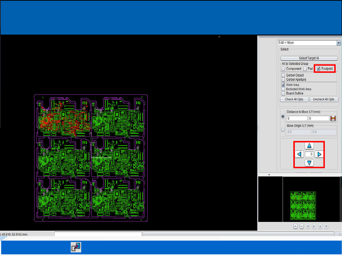 7. 点击上方图标 勾选右边Footprint(坐标)更改下面移动数值使之与GBR相接近重合。