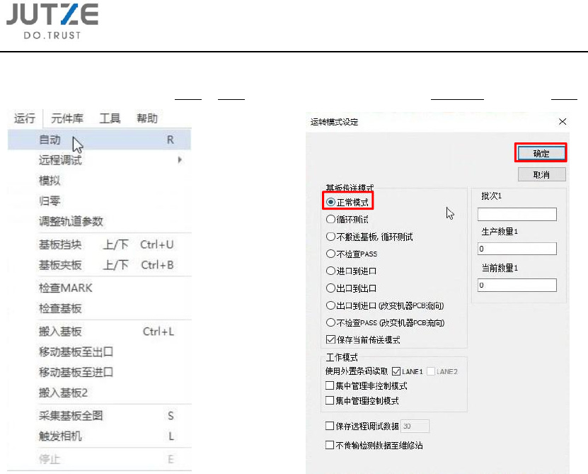 3.4.1 点击主界面菜单指令栏运行 - 自动,弹出运转模式设定界面,选择正常模式,之后点击确定。