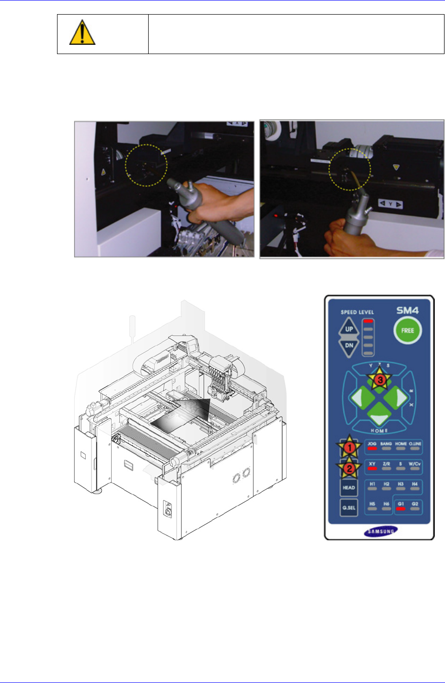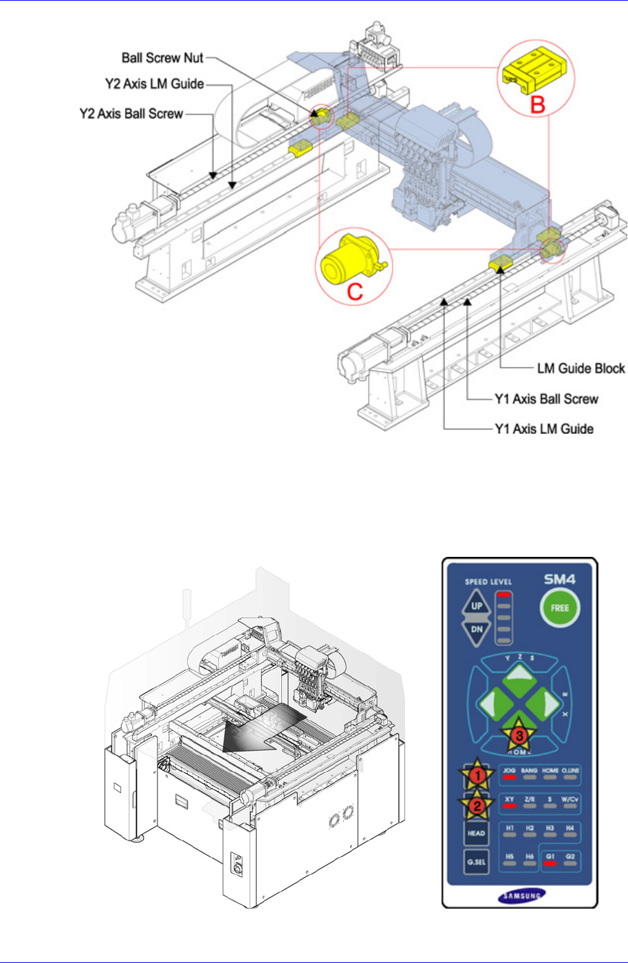Samsung Component Placer SM421 Maintenance Refer ence 警 告 单击 Teaching Box 的 ” Motor Free ” 键后,单击正面操作面板 的 ” Stop ” 与 ” Reset ” 键。检验时,必 须关闭电动机的电源。 使用本公司提供的 Cleaning Kit 的干净布块除 去 LM 导轨的灰尘等污质。 使用本公司提供的注油器,通过设 备前面的 Y1, Y2…