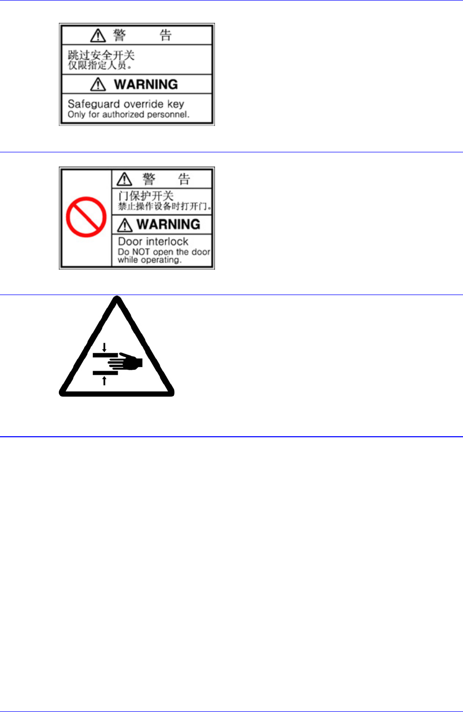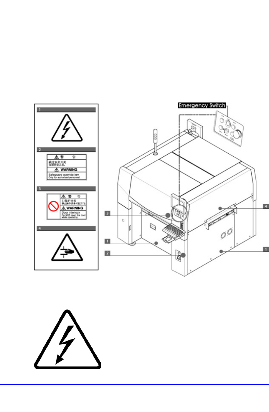 Samsung Component Placer SM421 Maintenance Refer ence 请不要移掉安全装置,否则可能 导致严 重的伤亡事故。 运行中禁止手触摸 贴有此标签的位置设置有移动体 ,在运行时 如果分解移动体或将盖子打开, 身体某部分 伸入到设备内部是非常危险的。 运行中禁止手触摸 贴有此标签的位置设置有移动体 ,在运行时 如果分解移动体或将盖子打开, 身体某部分 伸入到设备内部是非常危险的。 服务前中止设备…