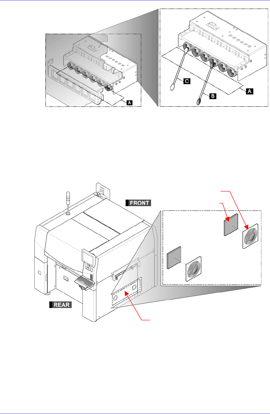 使用空气喷射器吹掉灰尘后,通过空隙(A),用棉棒擦拭角落的灰尘。必要时请