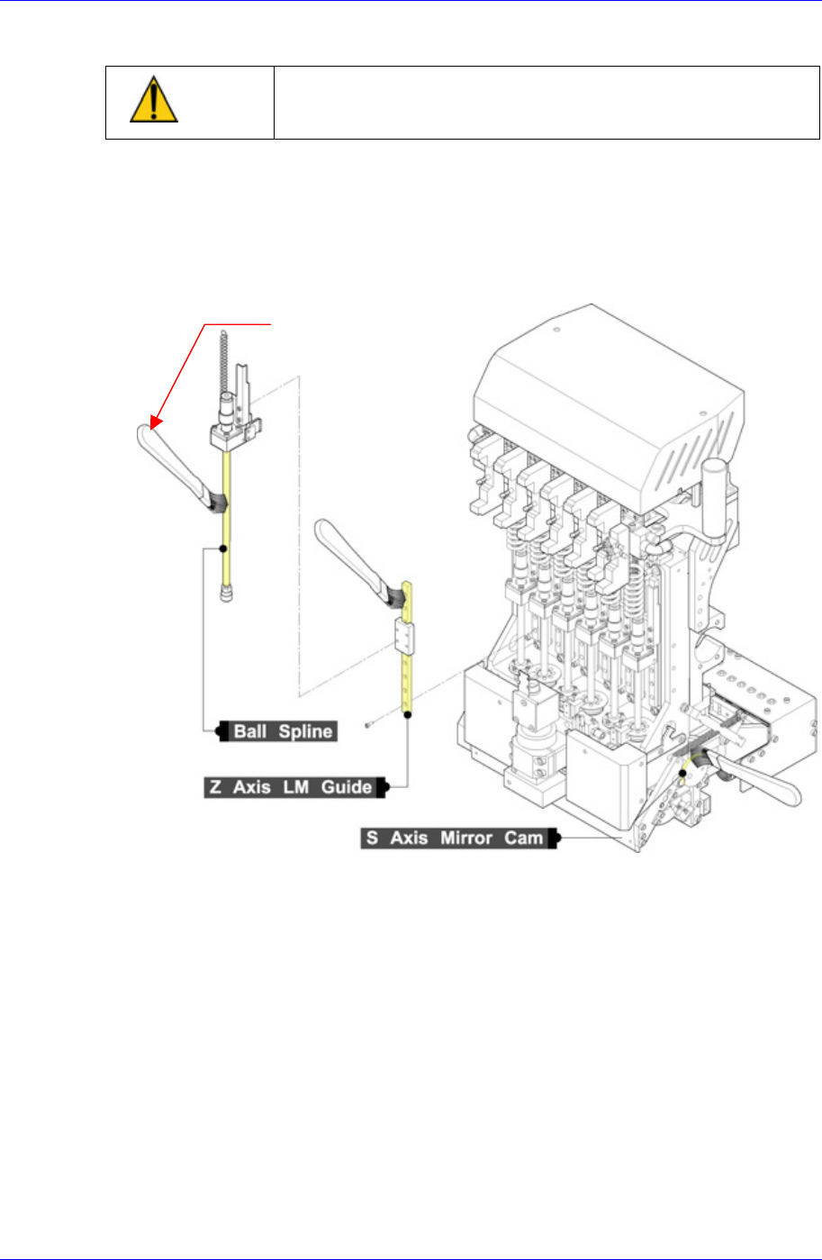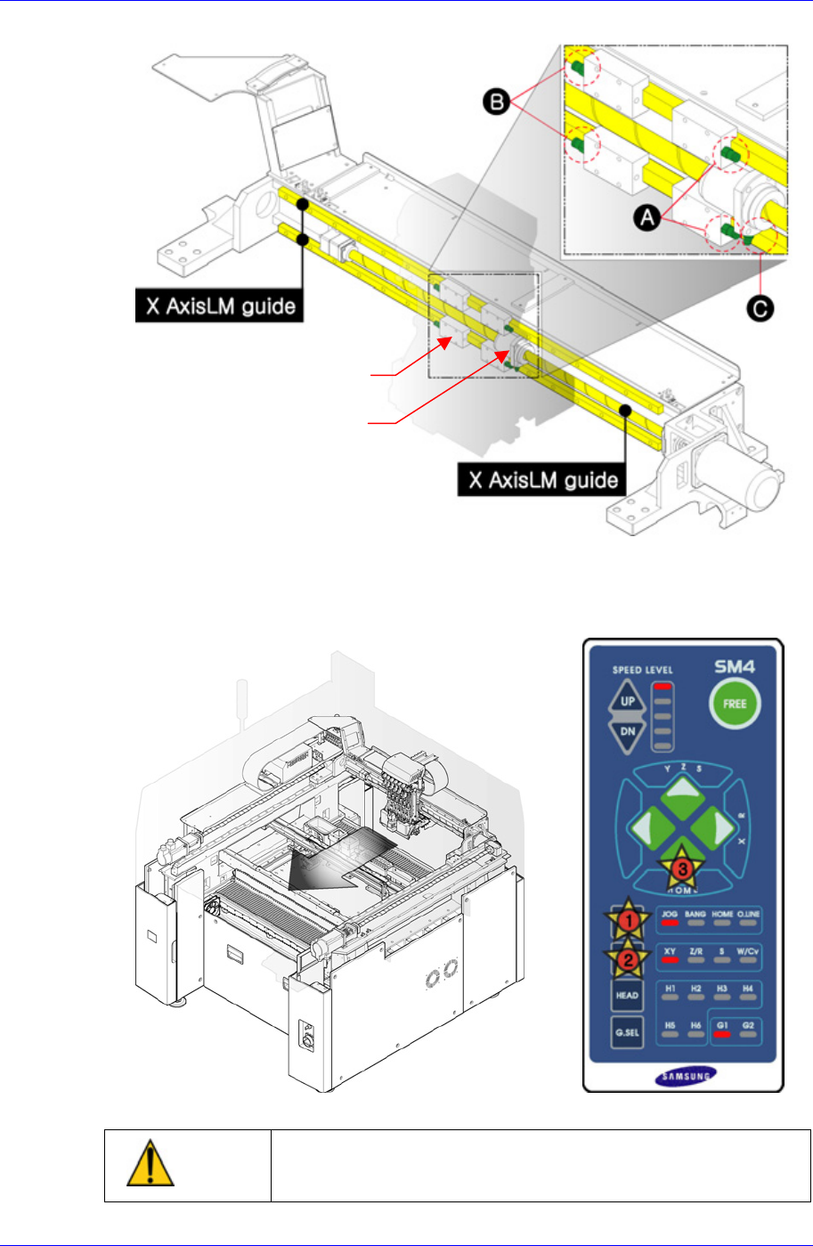 Samsung Component Placer SM421 Maintenance Refer ence 警 告 单击 的 ” Motor Free ” 键后,单击正面操作面 的 ” Stop ” 与 ” Reset ” 键。检验时,必 须关闭电动机的电源。 Teaching Box 板 作业空间不足时手动向前移动贴装 头组件。 使用本公司提供的 的干净布块除去灰尘等污质 , 必要时使用小型单 向电刷在 Ball Spline 及…