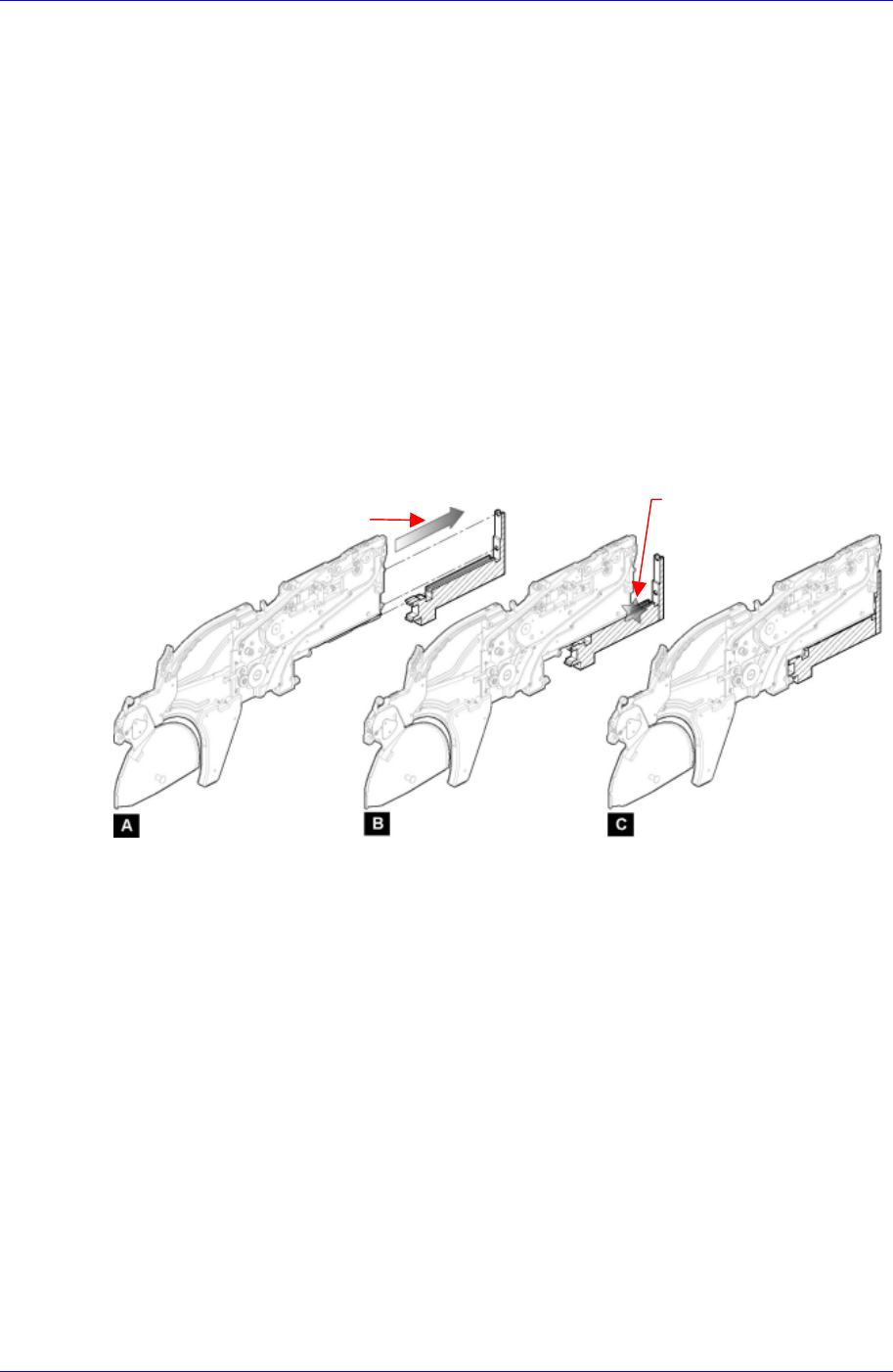 A: 喂料器安装前状态, B: 贴片或污质引起的非正常贴装状态, C: 喂料器正常安装