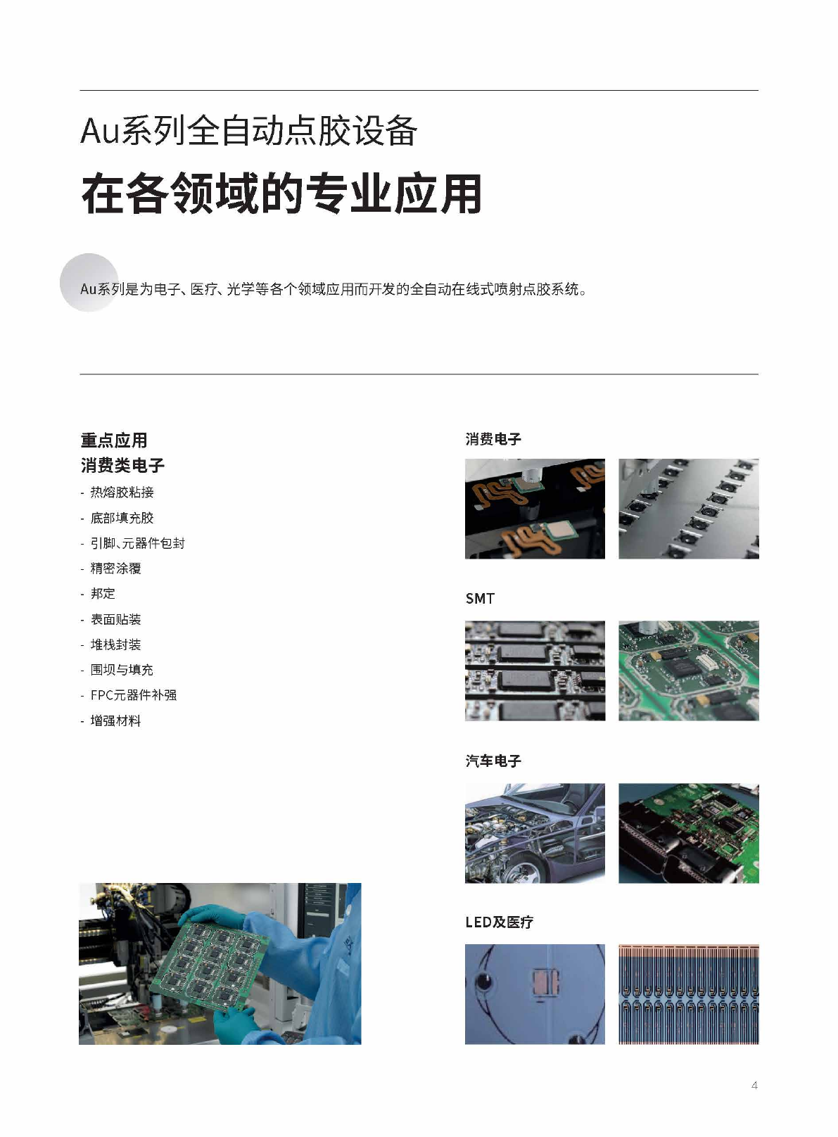 重点应用 消费类电子 热熔胶粘接 底部填充胶 引脚 、 元器件包封 精密涂覆 邦定 表面贴装 堆栈封装 围坝与填充 FPC 元器件补强 增强材料 消费电子 SMT 汽年电子 LED 及医疗 I m u Au 系列全自动点胶设备 在各领域的专业应用 Au 系列是为电子 、 医疗 、 光学等各个领域应用而开发的全自动在线式喷射点胶系统 。 r V ‘