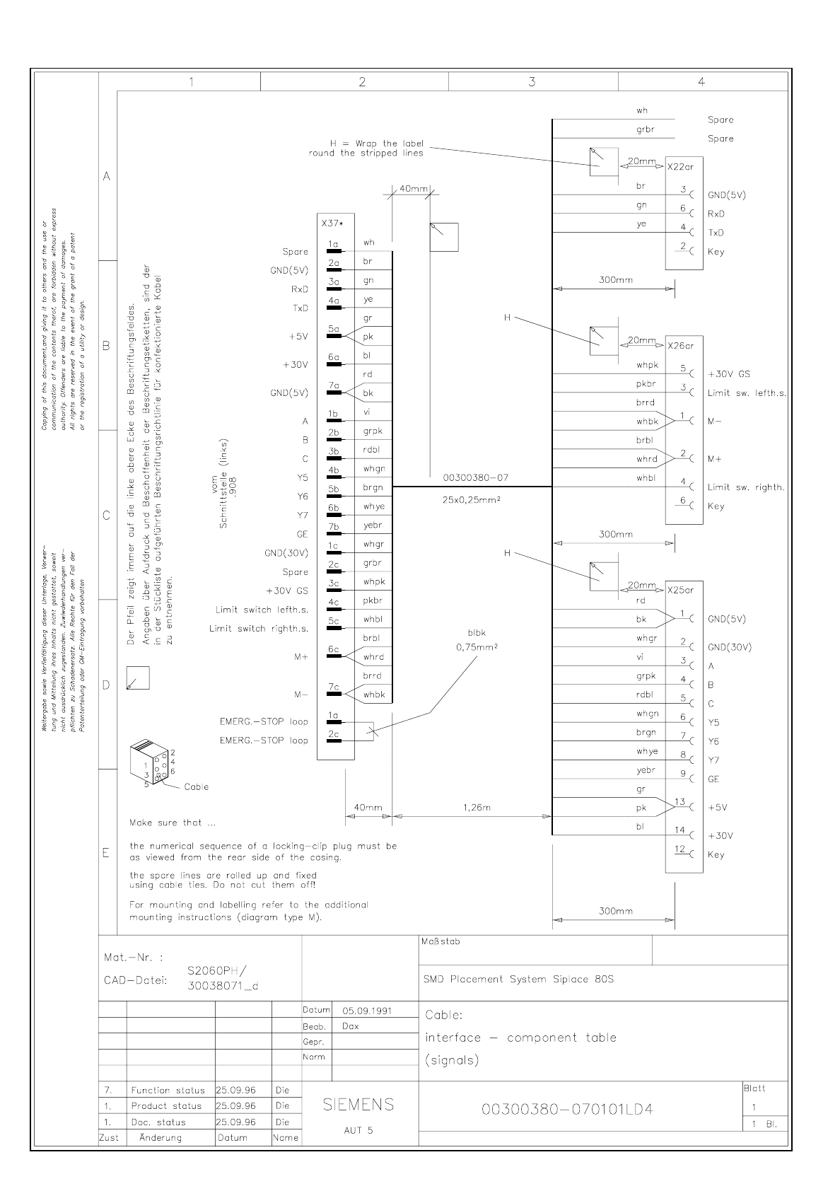 3.9 - 12 Cable Interface - compon ents ta ble(signa ls) SIPLACE 80S -20 Cable Interfa ce - compo nents t able(sig nals) 3003807 1.dw g 003003 80-07 0101LD4 C able In terface - comp onents tab le ( signals)
