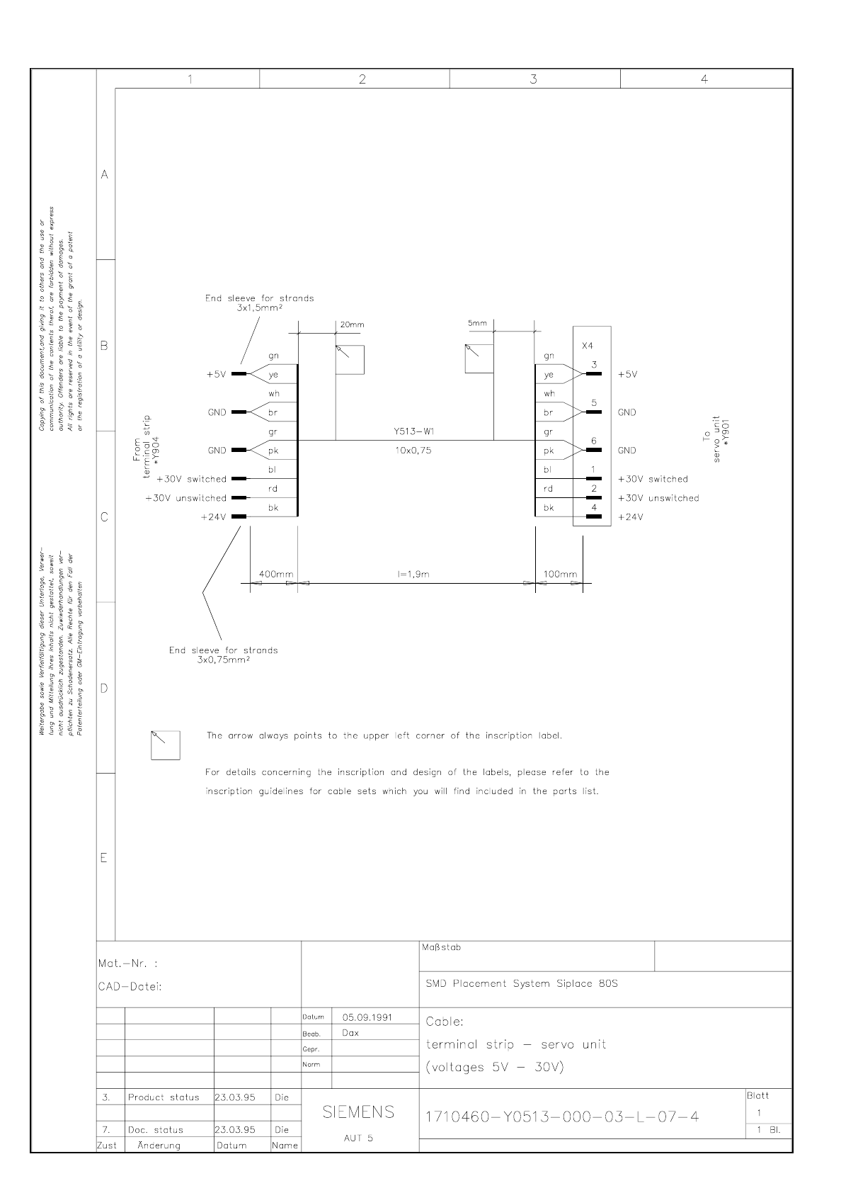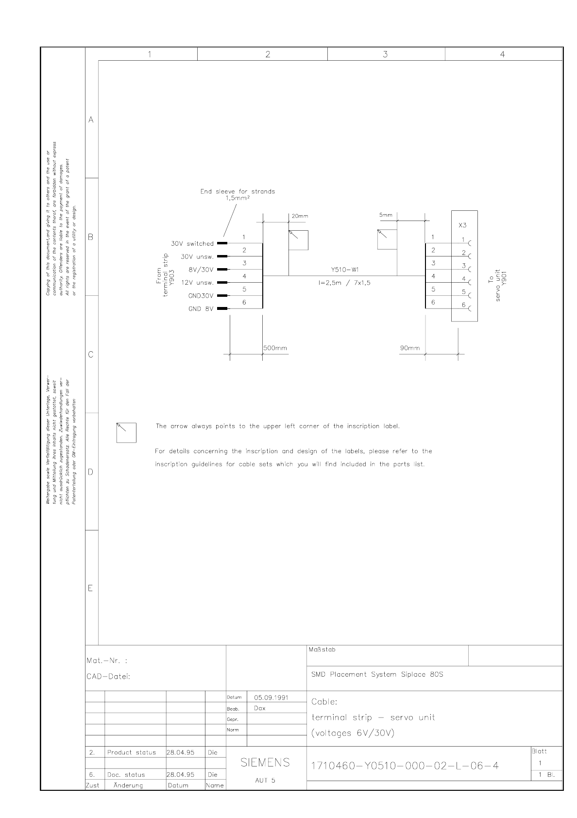SIPLACE 80S-20 Cable Termin al strip - servo uni t (volt ages 6 V / 3 0 V) 3.6 - 23 Cable T ermina l strip - s ervo un it ( voltages 6 V / 30 V) Y0510L 06.dwg 1710460- Y051 0-000-02 -L-06 -4 Cable Ter minal str ip - ser …
