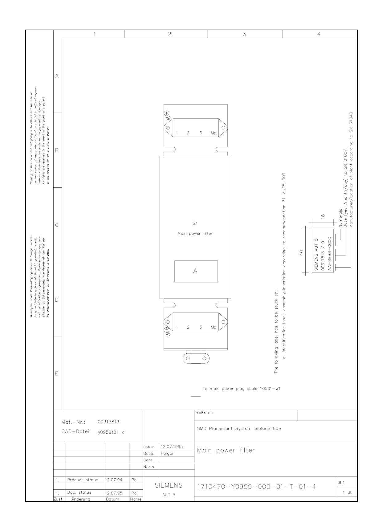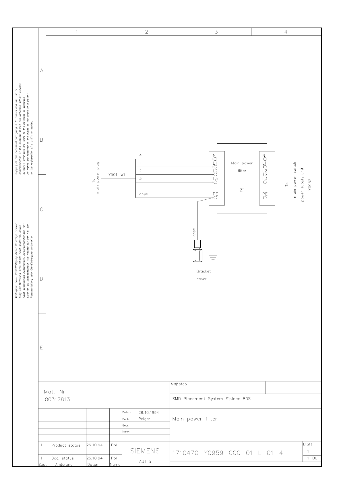 3.3 - 20 Main powe r filter SIPLACE 80S-20 Main power f ilter Y0959L0 1.dwg 171047 0-Y0 959-000- 01-L- 01-4 Main p ower filt er