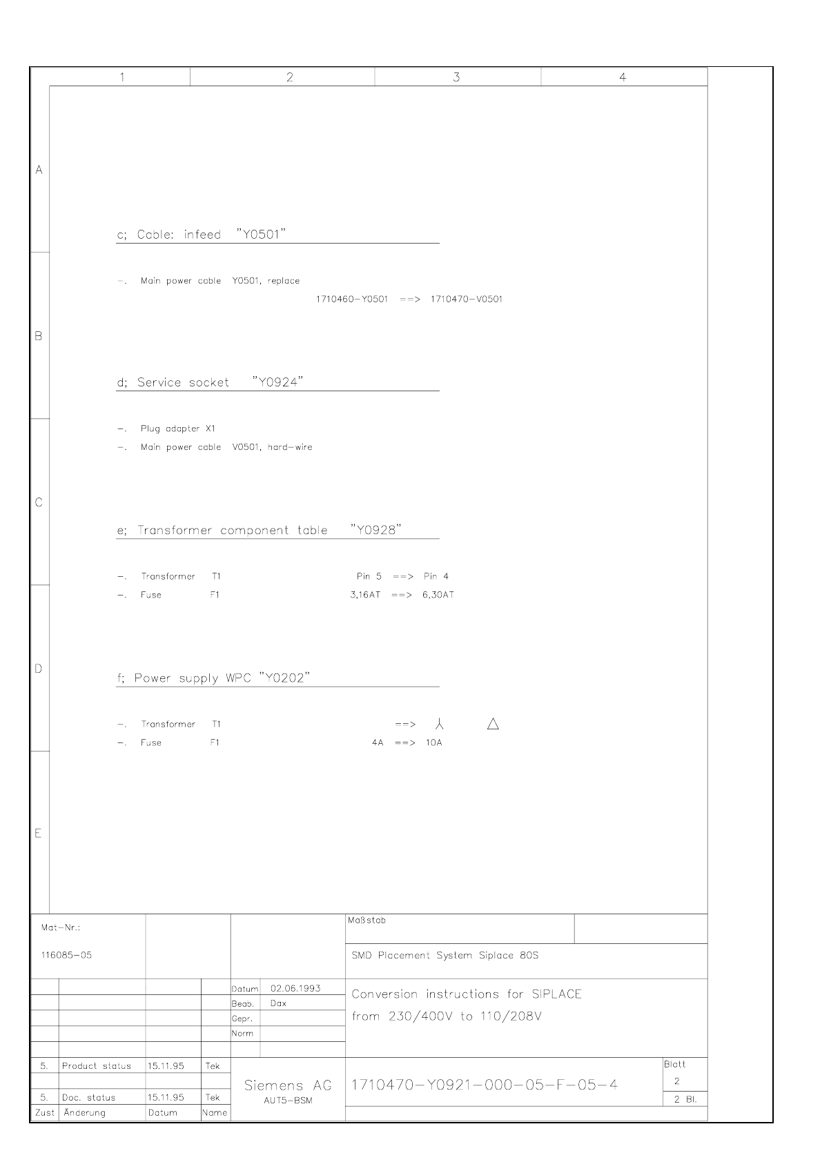 1710470-Y0921-000-05-F-05-4 Conversion instructions for Siplace from 230/400V to 110/208V (Sh. 1 of 2)