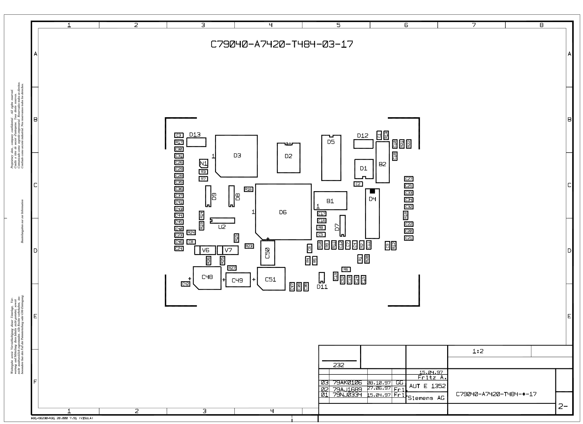 5 SIPLACE 80S-20 Printed Circuit Boards 133 00330573-010101ND4 DP-motor interference suppression board 3 2 D C F dp motor A 7 1 01. 01. 01. Interference suppression board AUT-BSM 00330573-01 0101ND4 # L. Bader 06.06.1997…