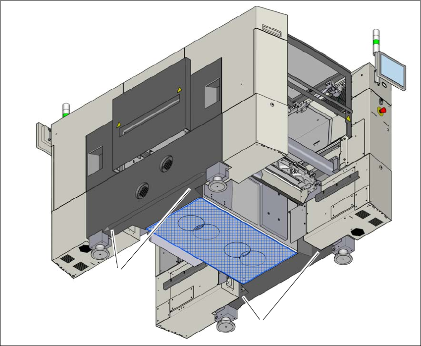 4 设置与调试 使用手册 SIPLACE SX1/SX2 V2 和 V3 版 4.3 设置贴片机 使用软件版本 SC.713.1 或更 新 版本 12/2020 212 4.3.10 拆除装运支撑架 装运支撑架连接在线性导轨上。每个 悬臂都用两个装运用的支撑架固定 在 X 和 Y 轴上。 从悬臂轴上拆除所有装运用的支撑架。 如果需要运输 SIPLACE 贴片机,务必将装运用的支撑架重新 安装到传送导轨上。 4.3.11 去除导轨…