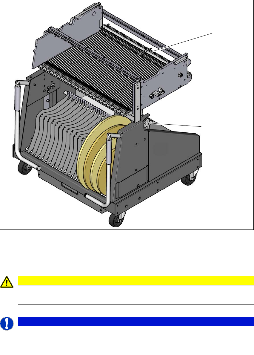拆卸用于料台高度检查的两支架 (左右两侧)之一时,因为转换料台很高,所以有碰撞