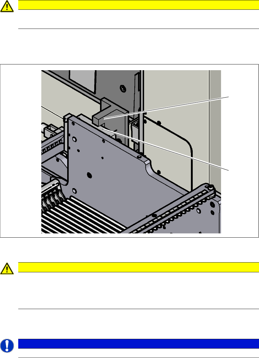 小心将元件料车完全推入贴片机,直至挡杆处。必须将转换料台的挡块 (2) 安装到贴片机馈