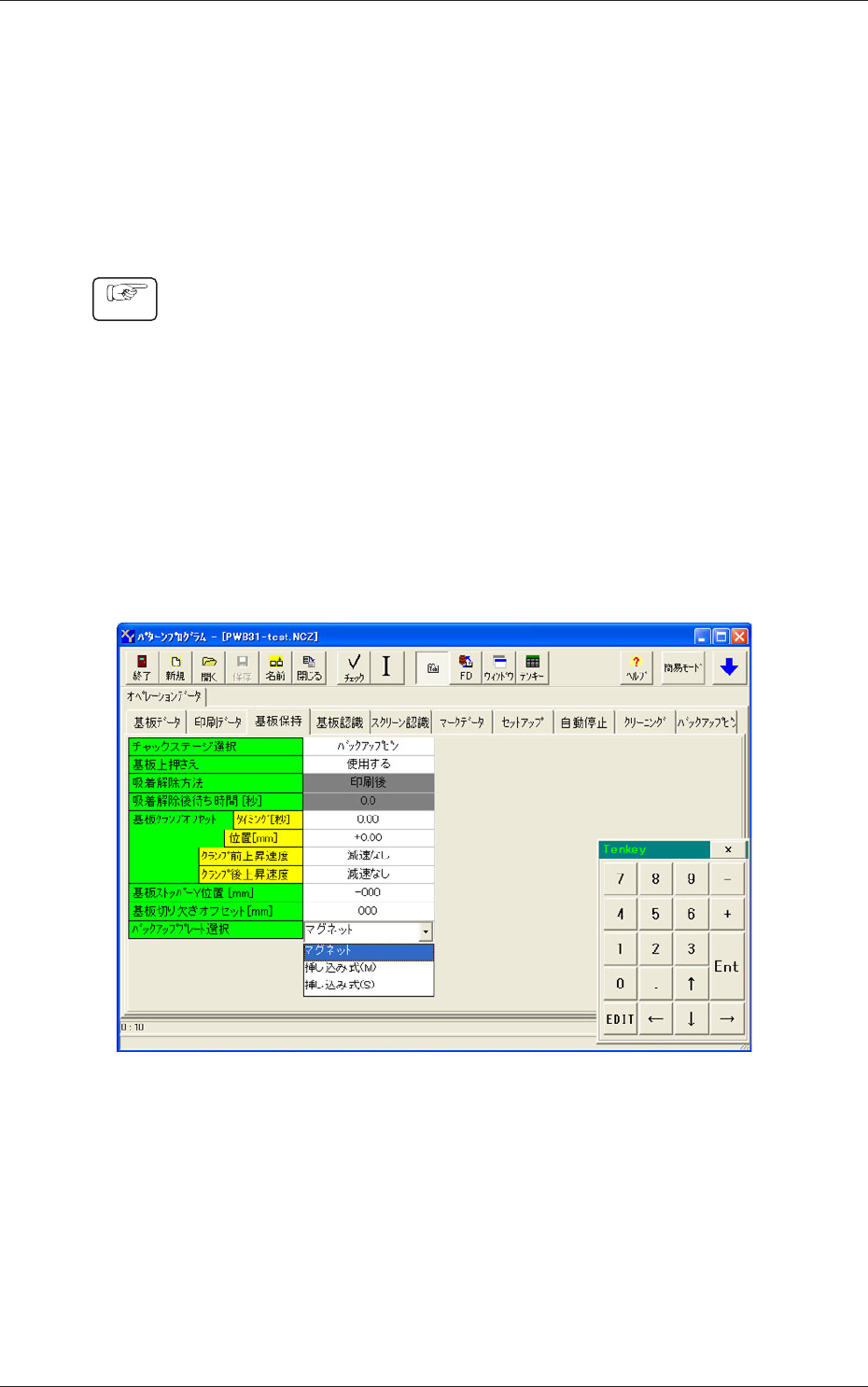 8 Tg 1404 -ID-SO 0704-001 3.2 生基板からのティーチング手順 基板認識カメラを基板上で移動させ、カメラ画像から、基板バック アップピンがセット可能な位置を教示します。 3.2.1 データの準備 バックアッププレートの種類を選択します。 手順 (1) パターンプログラム編集画面で“オペレーションデータ” タブの“基板保持”タブを押します。 (2) “チャックステージ選択”で“バックアップピン”を選択 します。 …