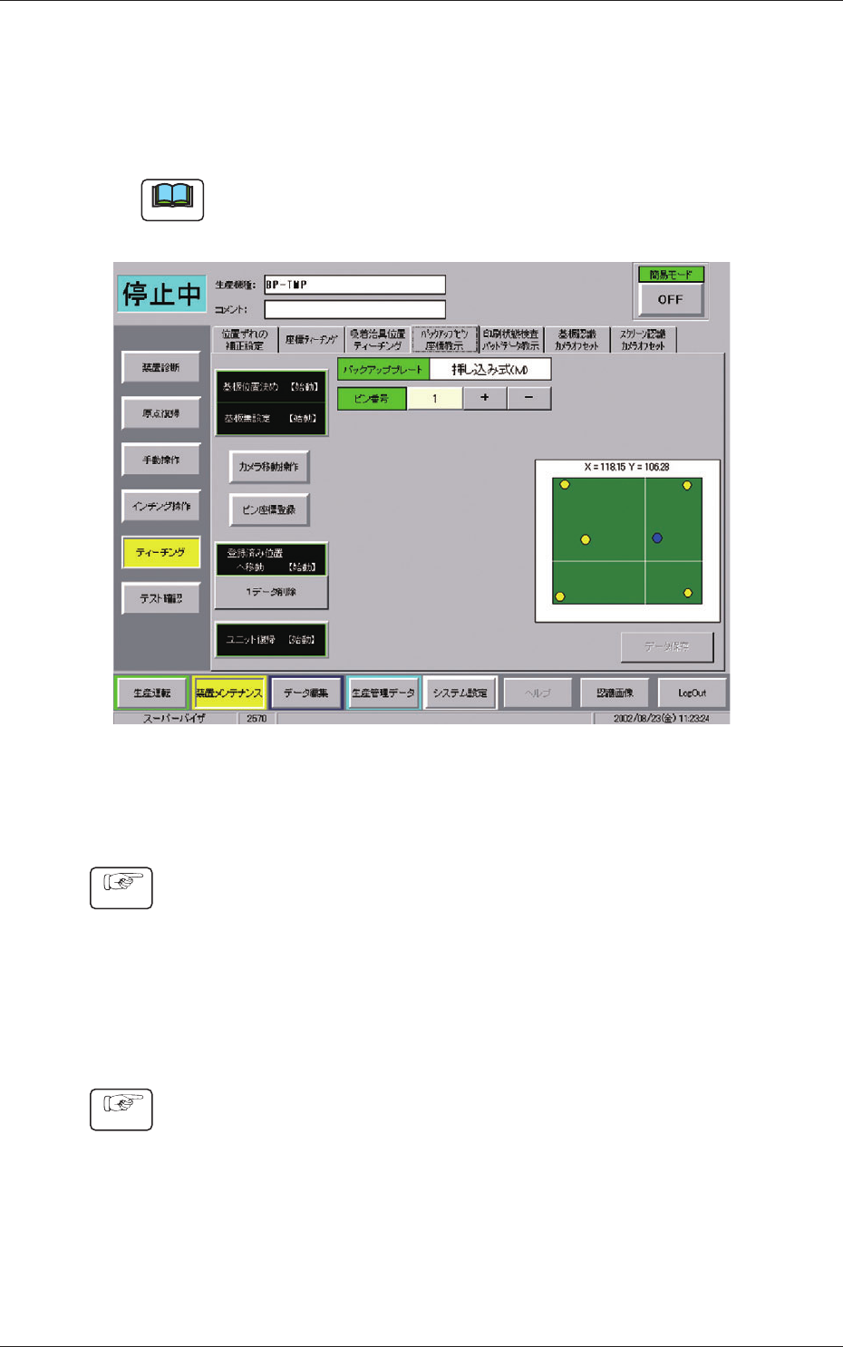 (1) “バックアップピン座標教示”タブシートの [ ピン座標登