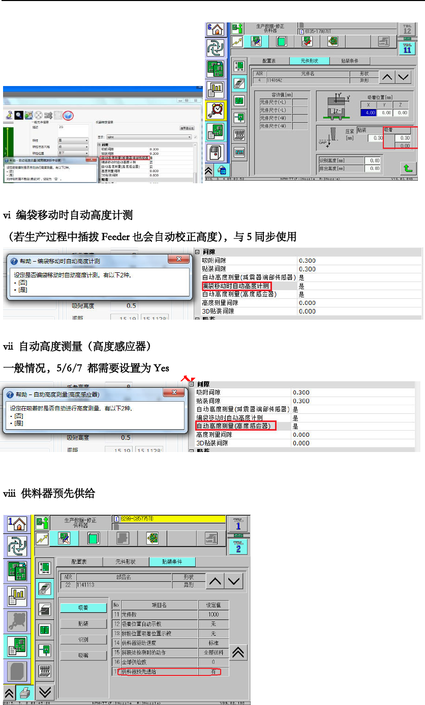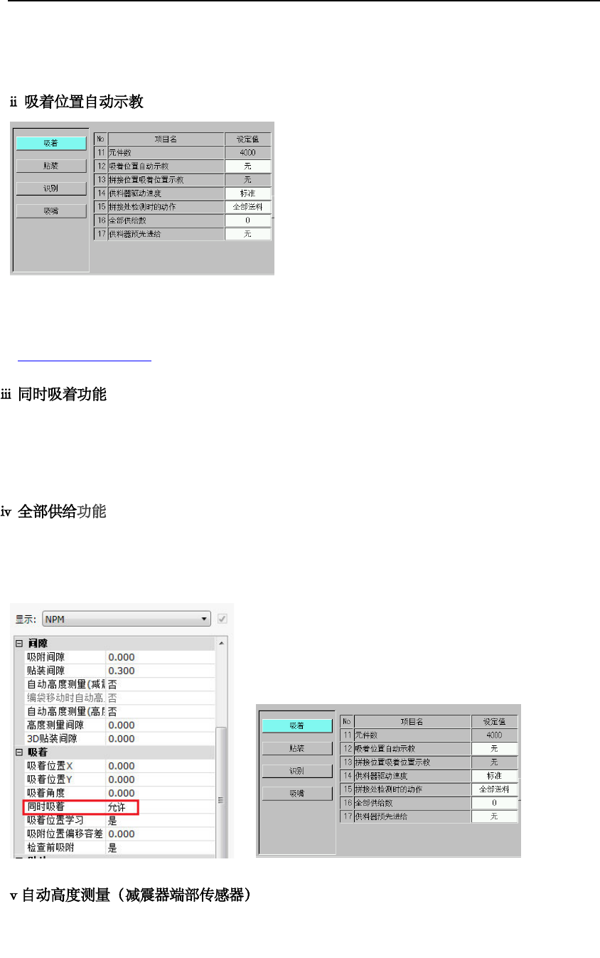 吸着位置学习 : 机器在正常生产 一段时间, 吸 嘴取料多多 少少会出现点 偏差 , 这个会 适当的 给出一些补偿 值 . 学 习是以吸 到的元件 的位置来补偿 吸料位置 的 主要是换线后 ,开机自 动进行吸着位 置校正。 置针对 8mm 的 Feeder . 吸着 位置自 动示教 是当 供料器状态 发 生变化时机器取 料前 会对发生 供料 状态变化的 供料器 取料位置中心 自动检测 。 . 十六:吸 取识别错 误 代表吸嘴同 时吸着,…