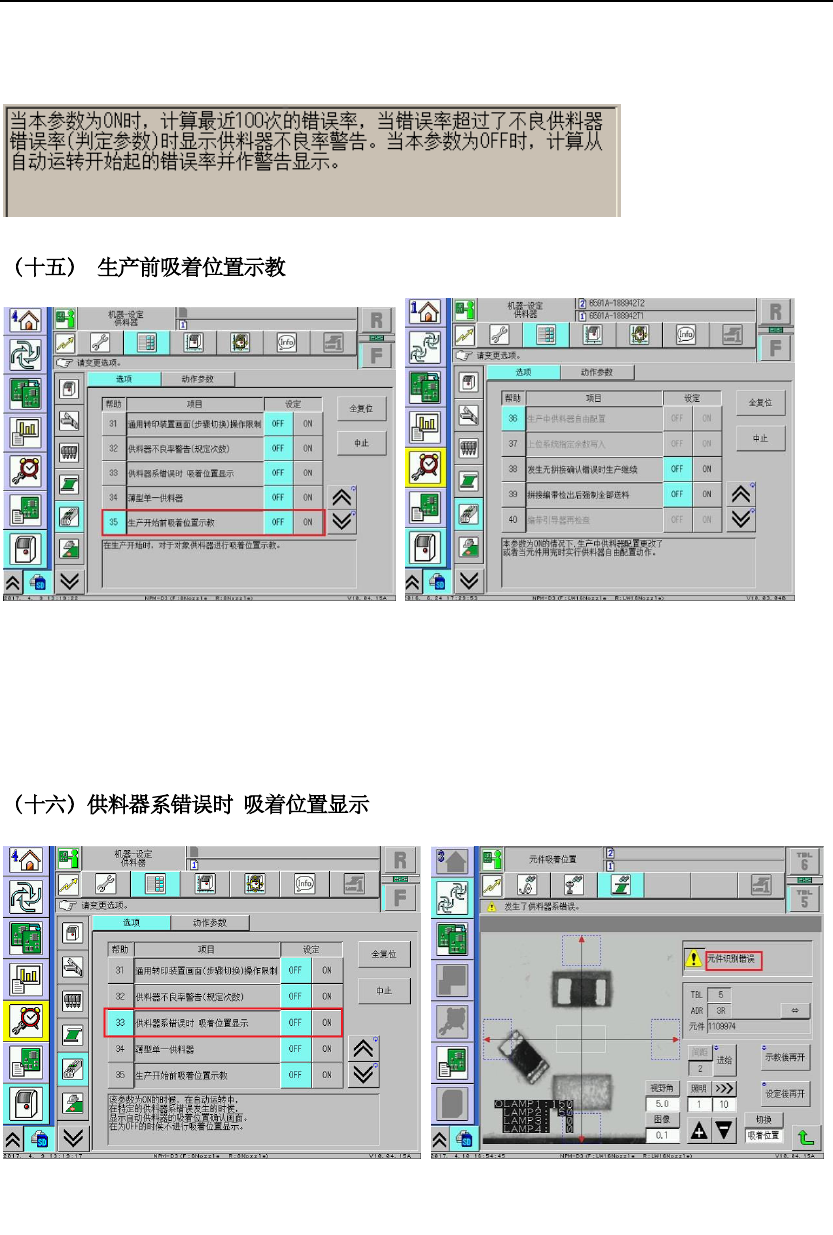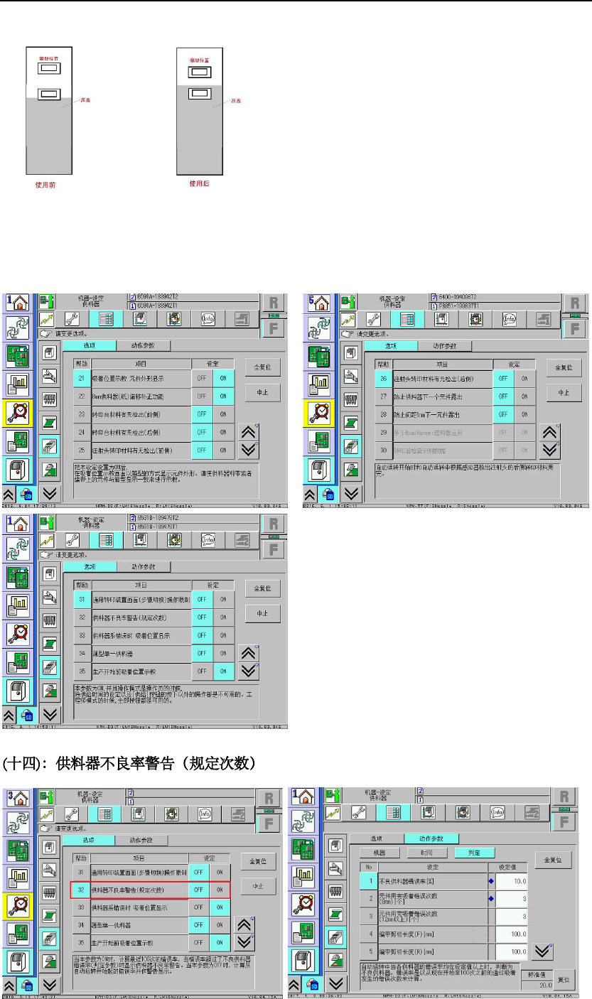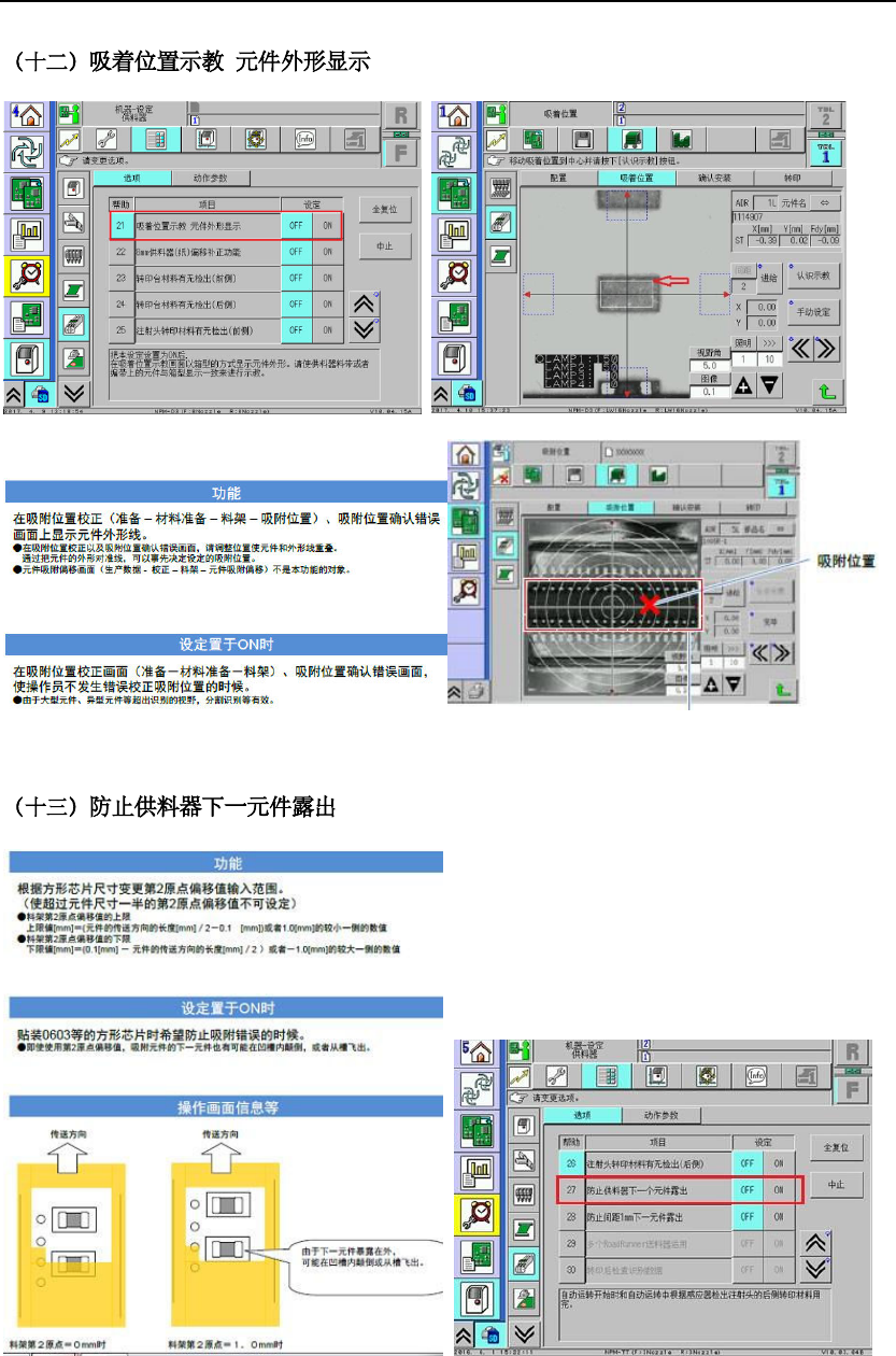 这个功能就是 可以防止 020 1 以下元件 在供料后 ,第二颗元件会 漏出来, 导致取料时候 会导 致被震动震出 料槽 , 防止下一个物料示 教时露出 飞达外 造成侧件, 调抛料适用, 开启此功能, feeder 马达动, 飞达原点 自动补偿