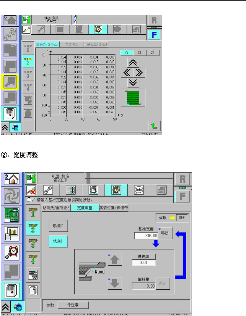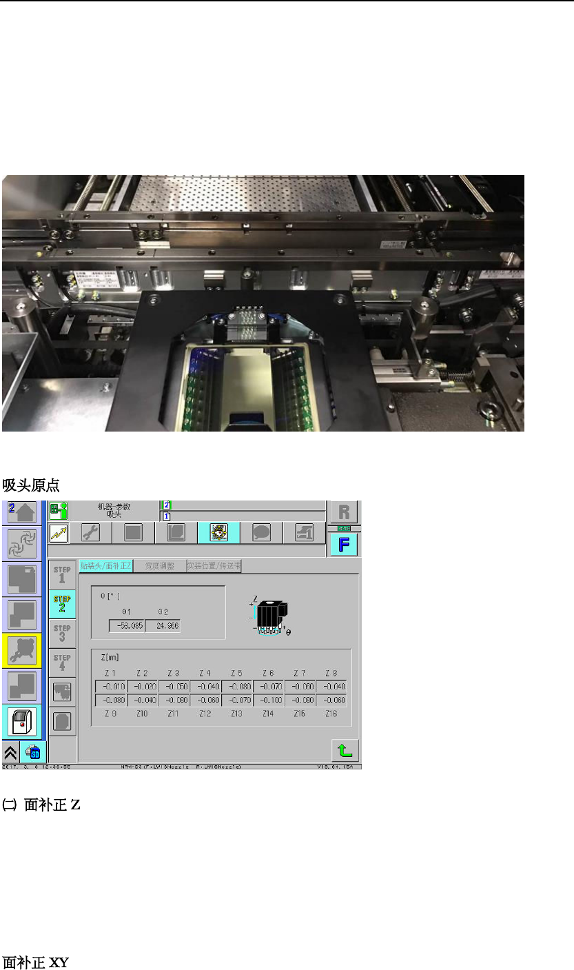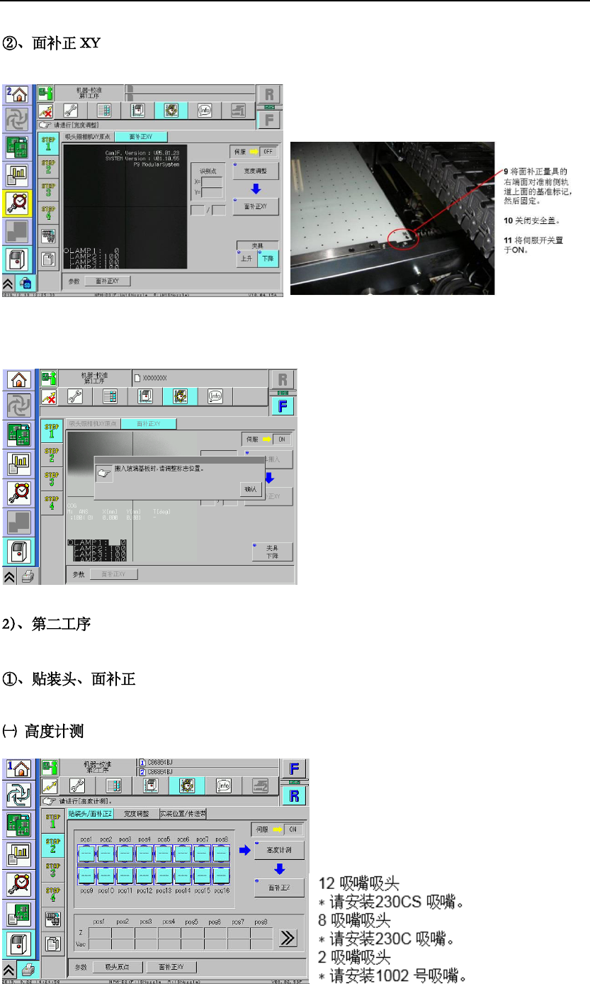 选择吸嘴位置 。 ∗ 请选择进行 高度计测 的吸嘴位置。 ∗ 在初期画面 上已选择 所有的吸嘴位 置,平 时基 本上也请选择 所有的吸 嘴位置。 但是, 有不使用的吸 嘴位置 时, 请仅选择所需要的吸嘴 位置。 确认是否已正 常结束。 • 每个 吸嘴位 置的显示 在高度计测正 常结束后 ,会从‘ -- ’变 成‘OK ’ 无需使用治具 ,设备直 接在轨道上矫 正。 按 [ 面补正 Z] 。 • 吸头 将会移 动到作业 位置,确认吸 嘴的…