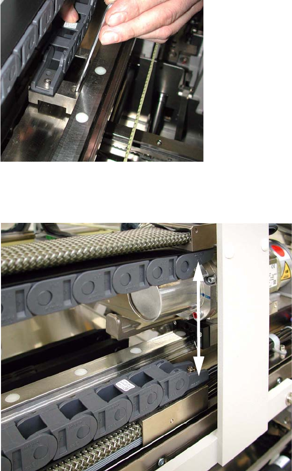 Now carefully lift the cable and hose carrier away from the power chain. At its highest position,