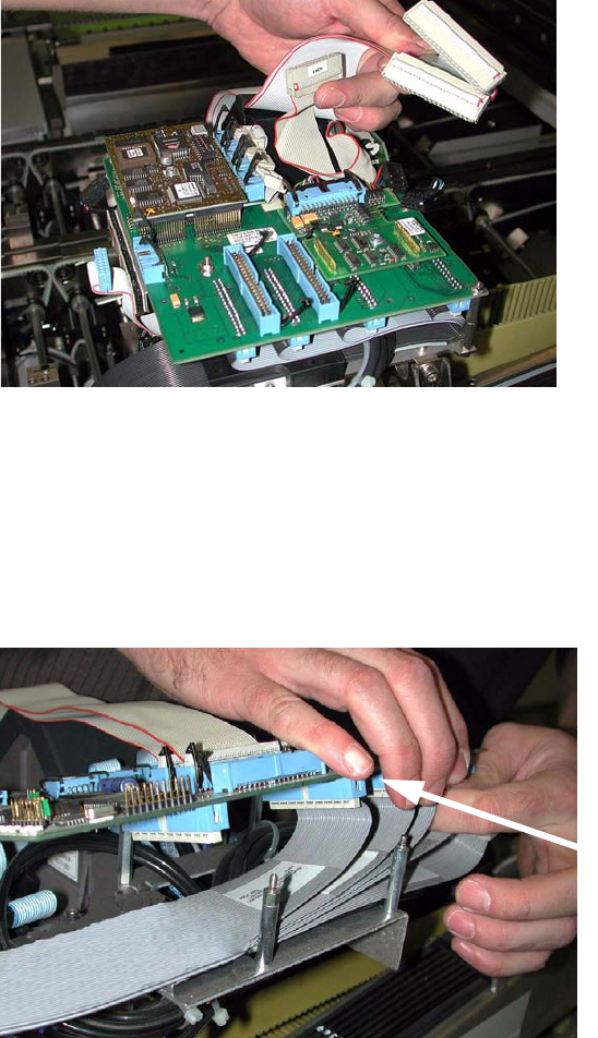 Austauschanleitung Portalkabelsc hlepp SIPLACE HS / S / F Ausgabe 01/2007 47 : Lösen Sie die Schrauben der Kle mmung am Bestückkop f. 1 : S tecken Sie die Druckluf tschläuche am Bestückkopf so a b: HS-50: am V akuume rze…