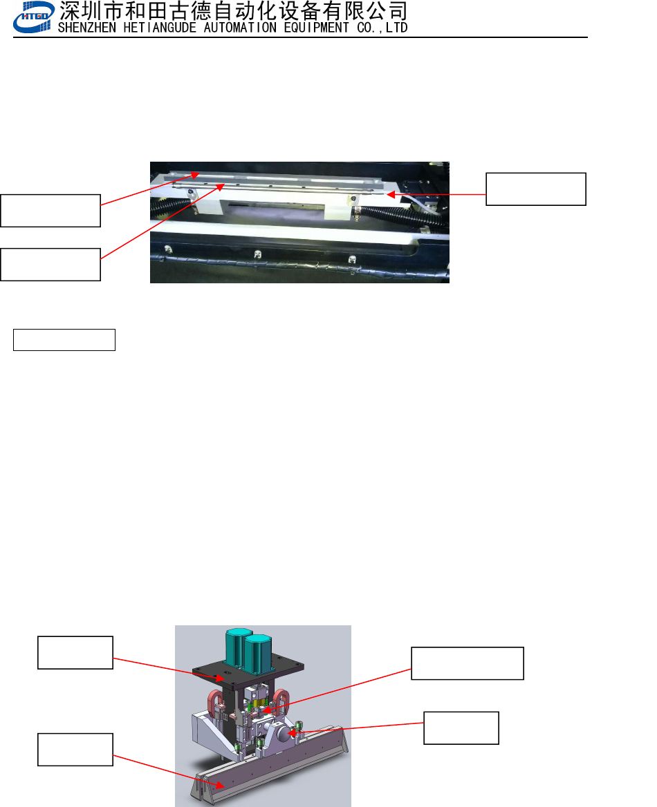 第三章 维 护 与保养 的模板应有专门存放的地方,避免损坏。 2 ) 模板上、 下两面磨损到一定程度使印到 PCB 板上的锡膏图形厚、 薄不 均,此时应更换模板。 图 3-3 清洗部分 过滤 管的 清理 : 每 月应打 开机 器 后下 部 罩盖, 过滤管位 于 Z 轴 支座下 部, 把过 滤管拆开,清理,清洁过滤网。 3.4.2 刮刀系 统 : 3.4.2.1 刮刀部分 1 .移动刮刀横梁到适合位置,松开刮刀头上螺钉 1 取下刮刀架; …