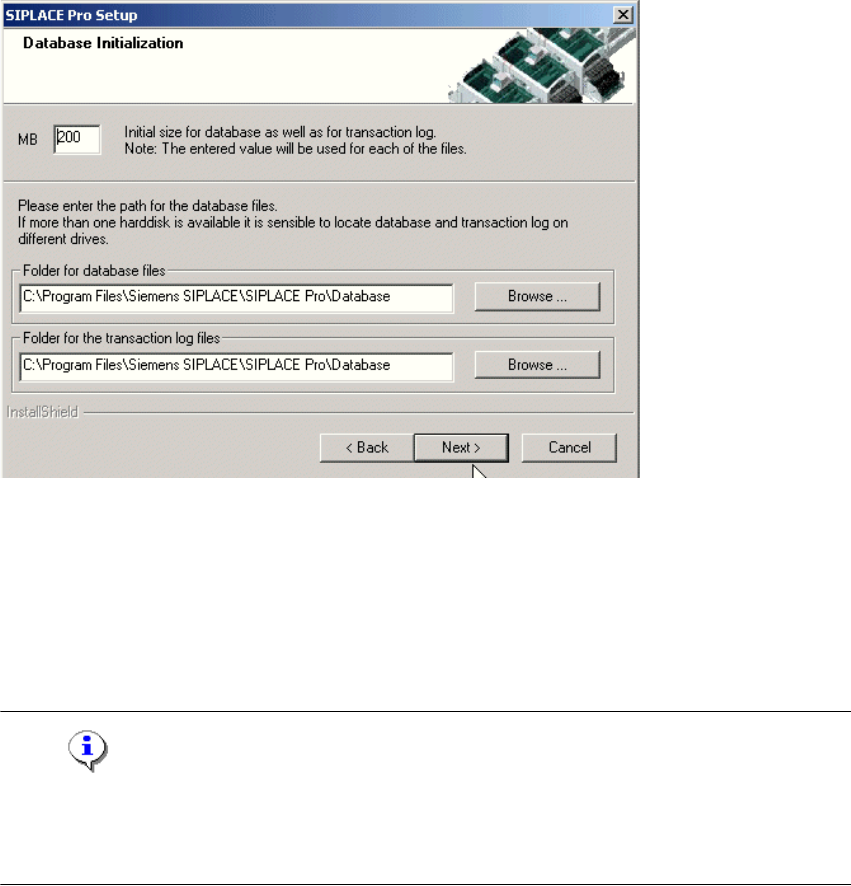 Installation Manual 4 Installation of SIPLACE Pro and possible Setup Types SIPLACE Pro 7.1 Edition 11/2009 US 26 4 Fig. 4 - 13 "Database initialization" dialog box The figure you enter in the MB text box define…