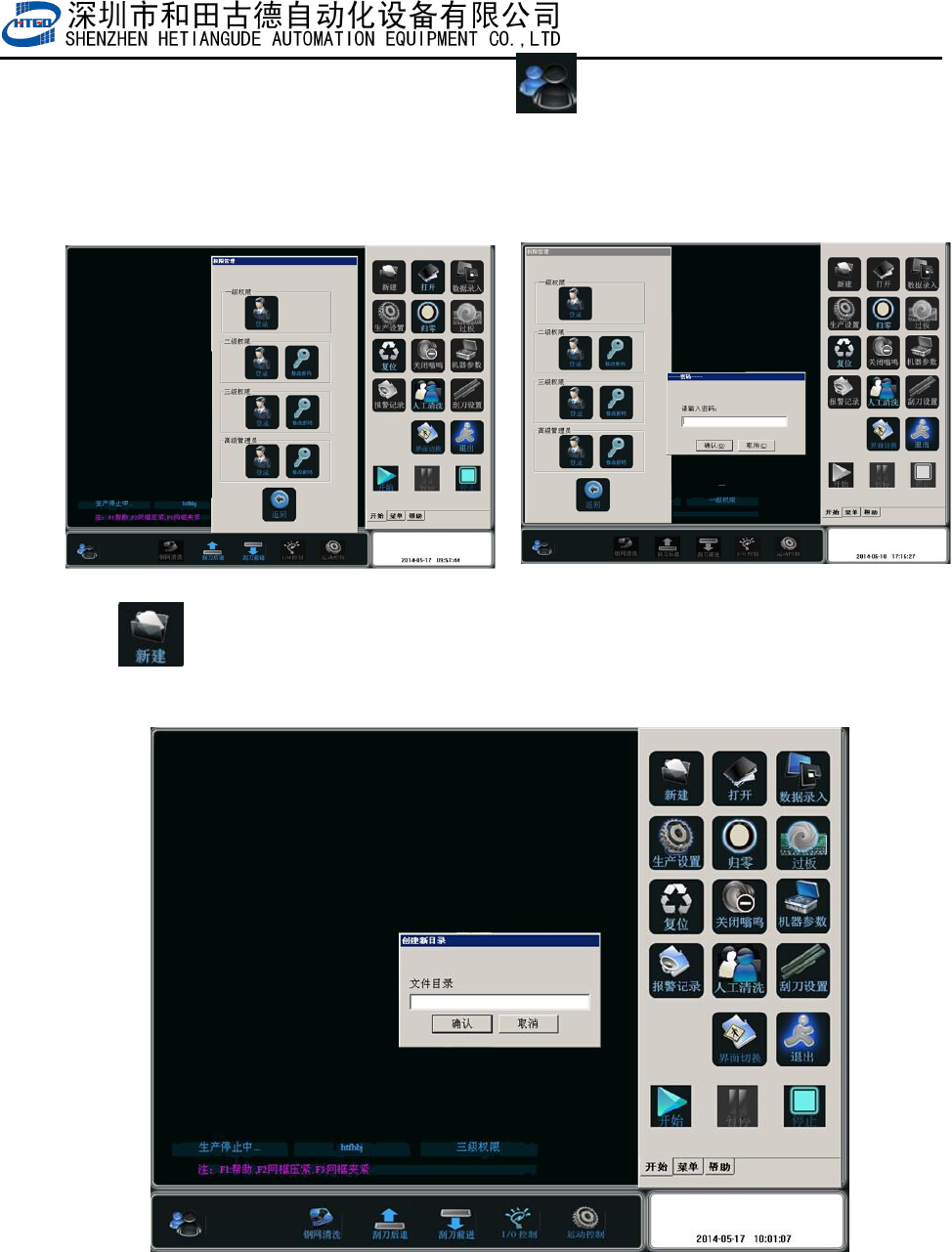- 17 - 第三章 生产工作流程 4. 在图 3-4 中点击 『退出』 或者单击主菜单栏 [ ] 按钮, 出现 3-5 画面 , 选择 “三级权 限”用户,输入密码“ htgd ” ,点击确定。进入到“三级权限”用户环境。 用户权限 说明 ;一 级权限为 最低 操作 者使用, 可以 调用 旧程 序及生产 操作 。 二级权限 有除 机器 参数与刮 刀设 置外 所有权限 。 三级权限 可以 修改 机器参数 3 、 4 与刮刀设 置 图 3…