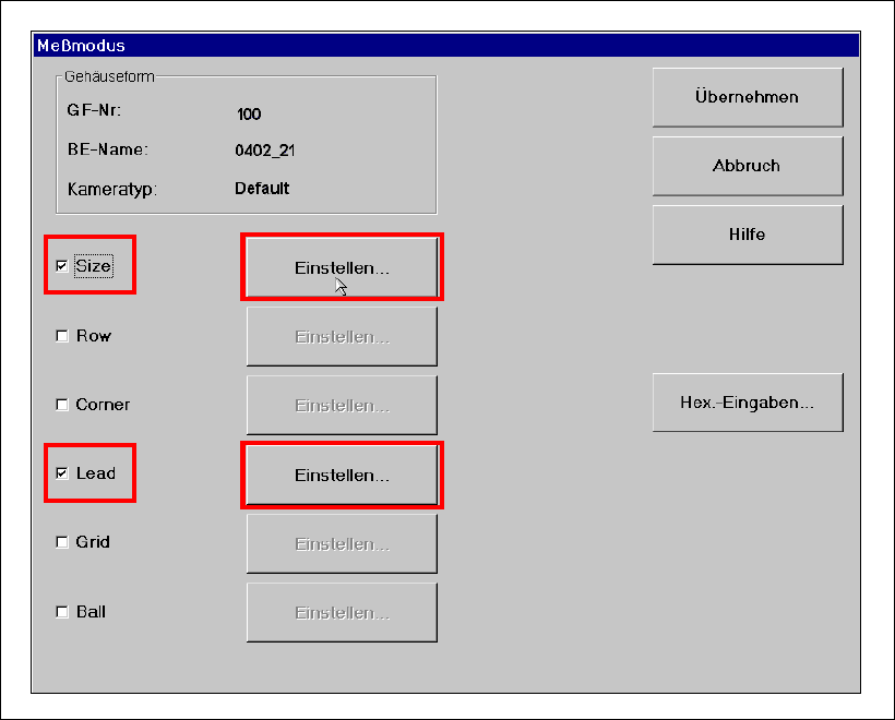 Im Menü Messmodus dürfen nur die Kästchen für ’Size’ und ’Lead’ angeklickt sein. Die Messmodi