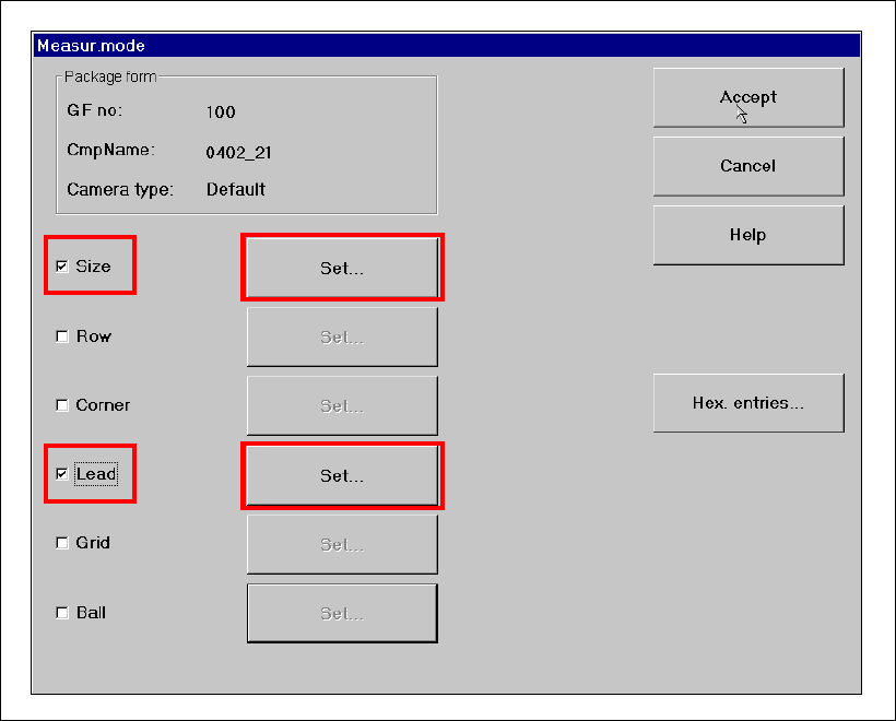 Only the ‘Size’ and ‘Lead’ check boxes must be checked in the Measuring Mode menu. The ‘Row’,