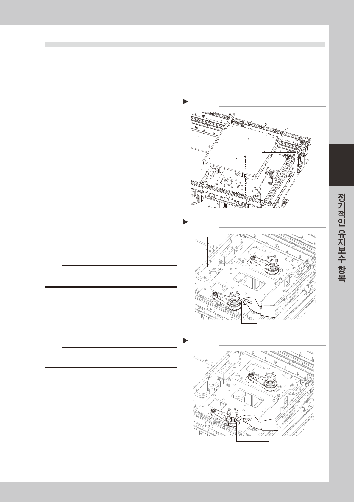 3-54 3 5. 7 컨 트롤러부 5 . 7 . 1 필터의 청소 청 소 할 필터 는 2 종 류 이 며 , 하기 의 3 군데에 설 치 되 어 있 습니다 . 시 스템 컨 트롤러 용 : 장비의 배 면 중앙에 1 군데 서 보 컨 트 롤러 용 : 정 면 우측에 1 군 데 , 배면 우측에 1 군데 1 대차 를 탈 착 합 니다 . 안전 을 위해 , 장 비 의 전원 을 차단 시 키 고 대차를 탈착해 주 십…