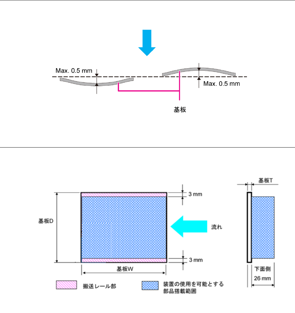 次の図に示すように、プリント基板の両端から 3mm の範囲は部品を取り付けできません。