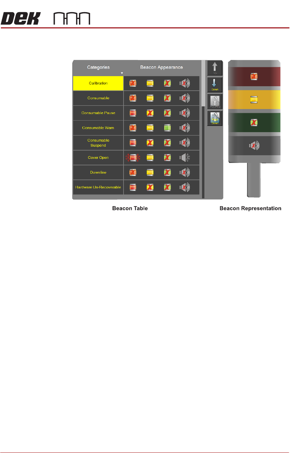 Select the category from the table followed by the lights or buzzer on the beacon