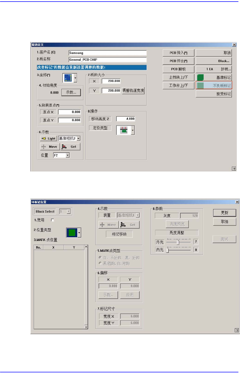 6-25 Board 定义 1) Block Select 不是 Block PCB 则省略 2) ‘ 位置类型 ’ 设置 3) ‘ 标记位置 ’ 设置 在 < 标记 位置 > 领域选择基准标 点击 < 移动 > 按钮用 Fiducial camera 移 动到所选的基准标。 调节成基准标的中心与 SMV isionQ 窗的 十字线中心一致 点击 < 登录坐标 > 按钮输入基准标坐标 4) ‘Shap…