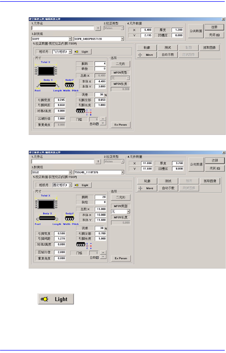 7-47 元件的登记 7.1.3. IC 部品的数据设定 7.1.3.1. SOP /SOJ/SOP2/SOJ2 部品的数据设定 设定有关 SOP 部品排列数据。 图 7.17 “ 封装组 = SOP” 时的对话框 图 7.18 “ 封装组 = SOJ” 时的对话框
