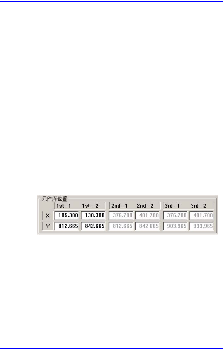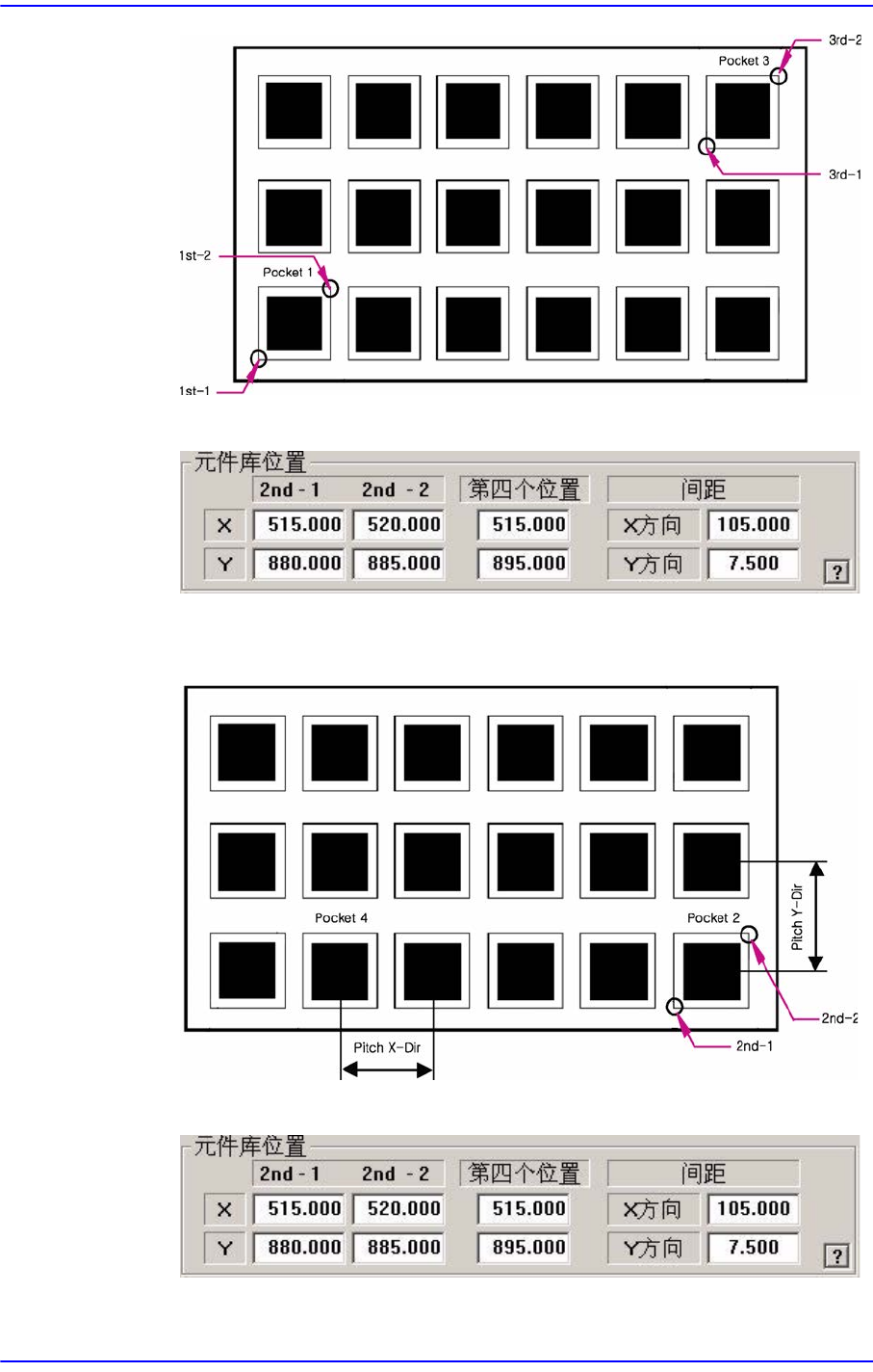 8-21 供应装置的设置 部品拾取位置也可以使用以下 方法来指定。 <3 槽中心 > 如下图所示输入 1 , 2 , 3 号 Pocket 的中心坐标。 <2 槽对话 框 > 如下图所示输入 1 号, 3 号 Pocket 对角线顶点 的坐标。