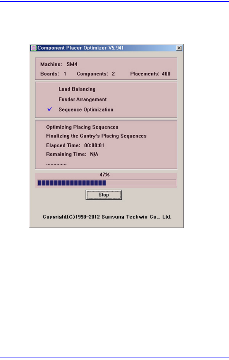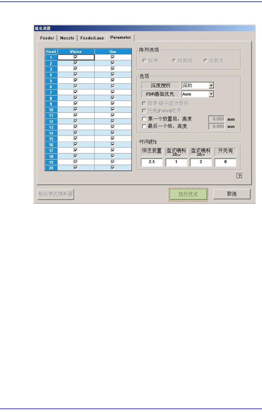 10-10 Samsung Component Place r SM481 Administrator's Guide 10.6. Optimizer Dialog 点击 < 执行最佳化 > 按钮则执行最佳化。 图 10.6 " 优化器 " 对话框 第一部分显示的是设备型号, 部品种类数及总装帖点数。 第二部分通过检查标记显示优化的 进行阶段, 显示的检查标 记即目前进行的阶段。 第三部分显示更…