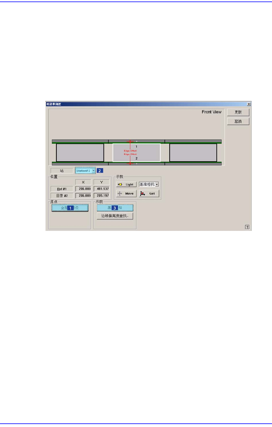 12-33 Machine Calibration < 更新 > 按钮 储存所有修改值后关闭画面。 12.3.4.1. Procedure 执行 Conveyor Calibration 方法如下。 1. “Conveyor Calibration” 对话框的 单击 < 全部回原位 > 按钮。 2. < 站 > 组合 框中选择要校正的 Station 。 3. 点击 < 基准告知 > …