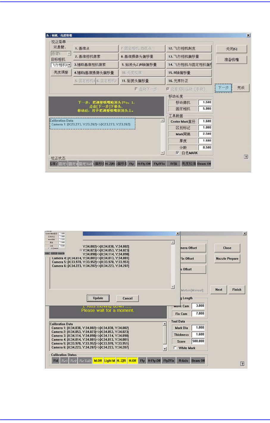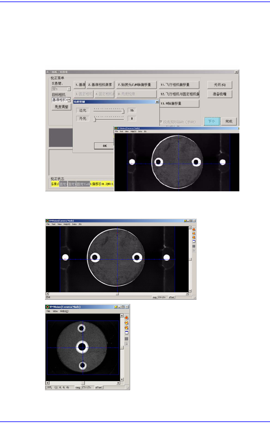 12-61 Machine Calibration 7. 那么, 磁头 1 上升到飞行相机的 Align 高度, 关闭 Mirror 。 然后在消息窗显示 ” 准 备标准。 8. 对于标准, 点击 [ 下一步 ].” 消息 。 此时在 < 目标摄像 > 组合框中选 择 ” 飞行相机 1” 点击 < 亮度 > 按钮, 在 ” 亮度 控制 ” 对 话框中 SMV ison 显示的 Calibration T ool …