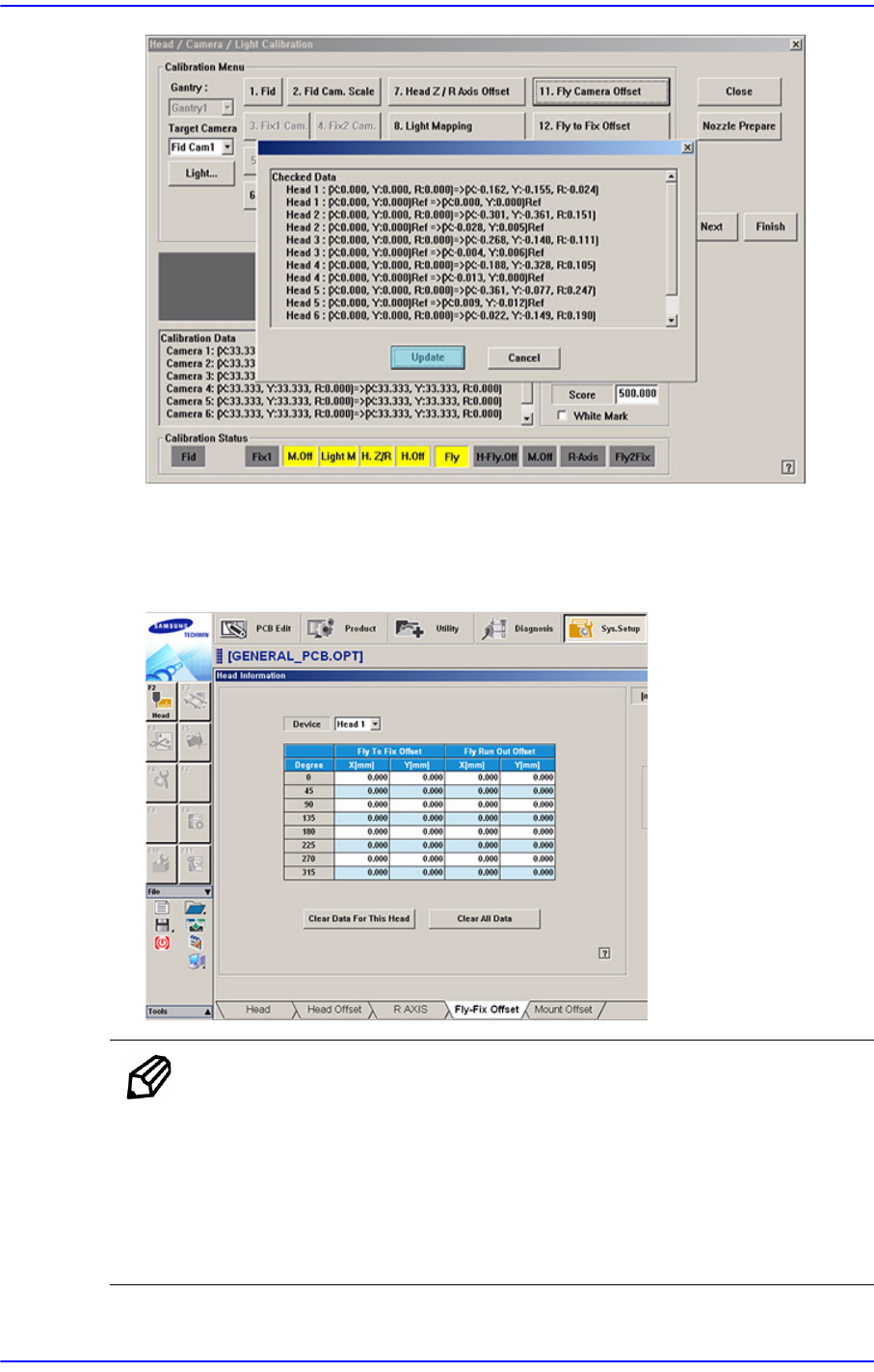 12-67 Machine Calibration 12.3.7.7. Fly to Fix Camera & Fl y Runout Offset Calibration 为了补偿在飞行相机部件识别后 贴装时因部件识别高度和贴装高 度不同而发生的偏 移。 此时发生的 Offset 的原因 为轴的弯曲、 Run-Out 等。 与贴装 高度相同的基准相机的识 别高度和飞行相机的识别高度值 , 根据角度进行补正。 校正作业之前首先要…