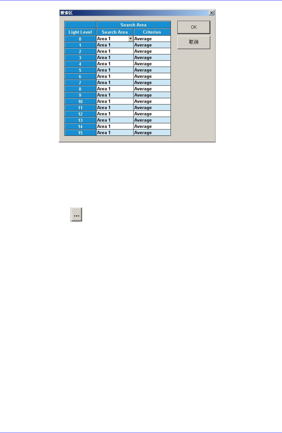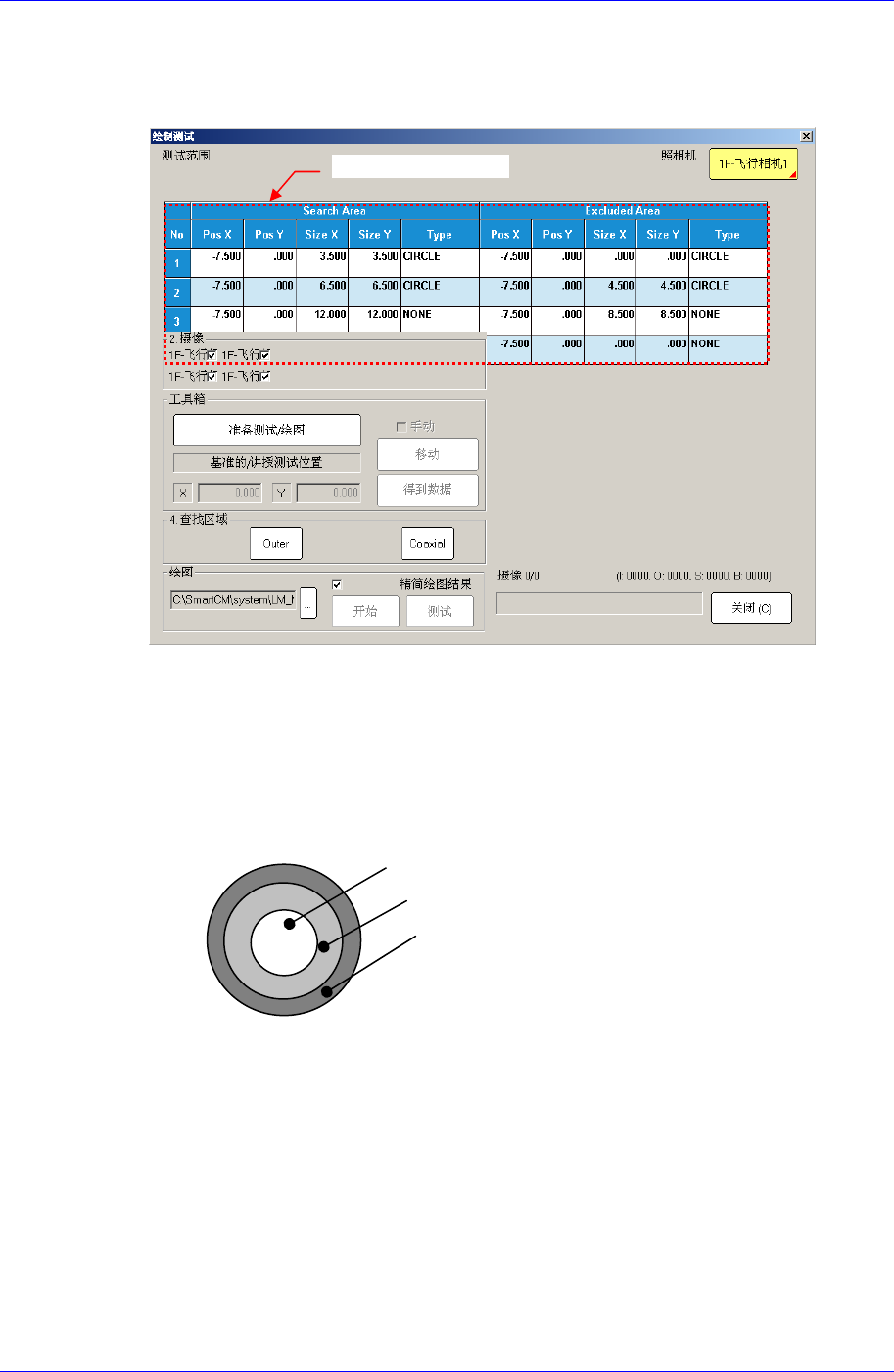 Calibration 3-57 à <No> 列 表示 Te s t A r e a 的一连 序号。 à <Pos X> 列 表示领域中心的 X 坐标。 à <Pos Y> 列 表示领域中心的 Y 坐标。 à <Size X> 列 表示领域的 X 方向大小。 à <Size Y> 列 表示领域的 Y 方向大小。 à <T ype> 列 指定领域的形态。 CIRCL…