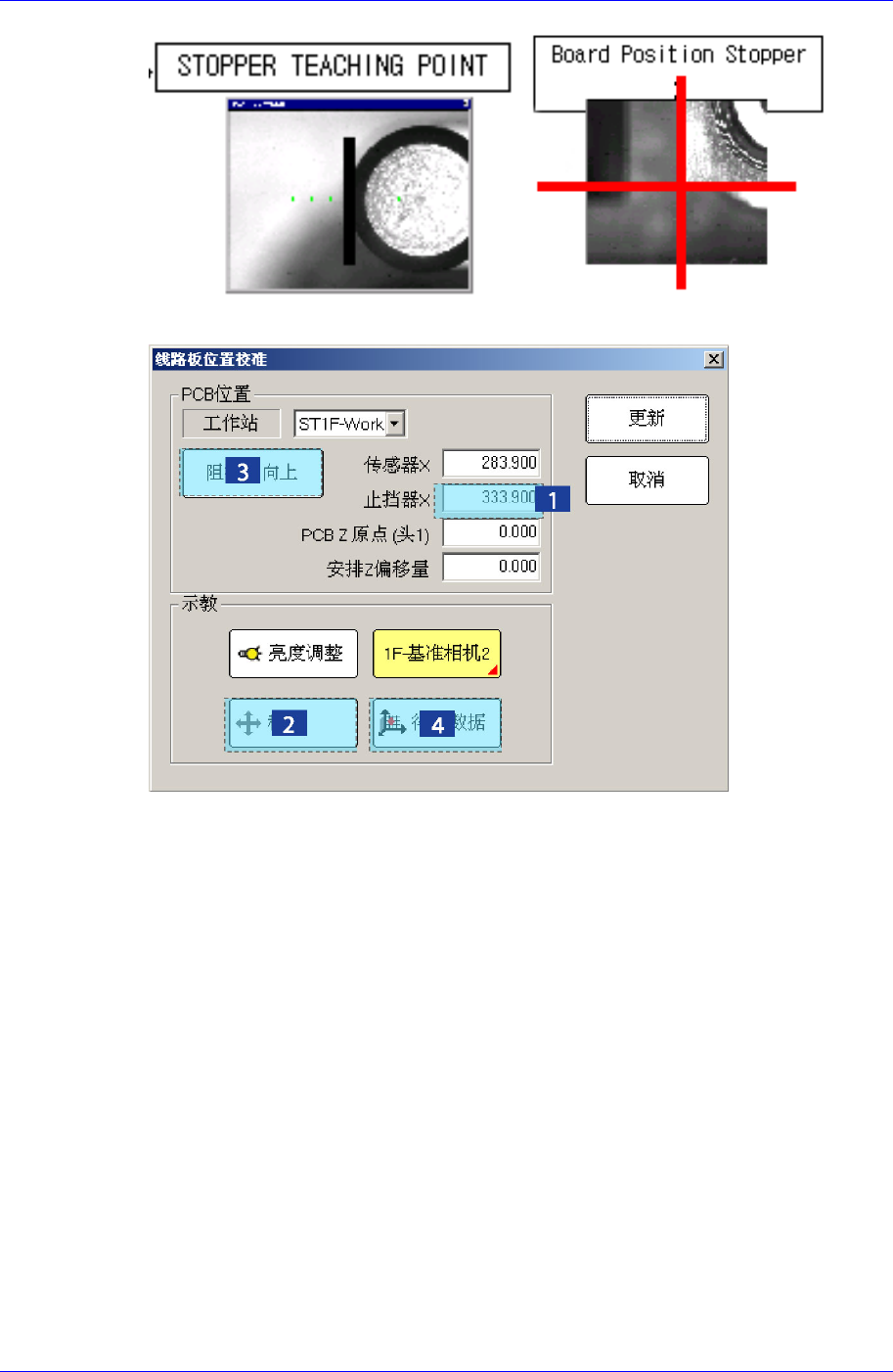 4. <止挡块上/下>按钮 , 先Up Stopper后再利用示教框(Teaching Box)请准确示教